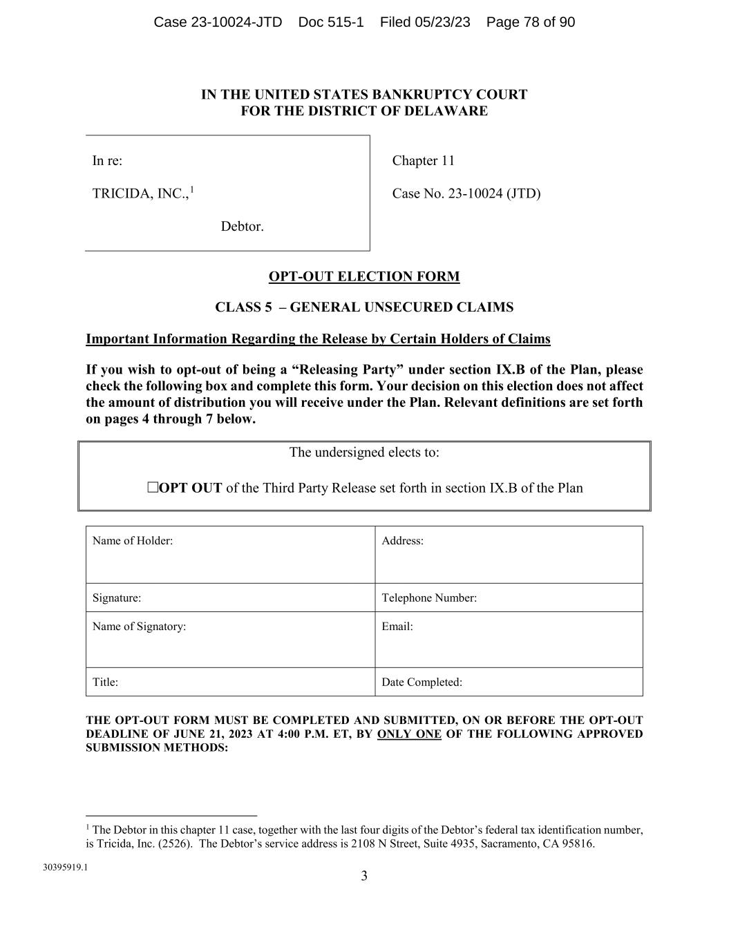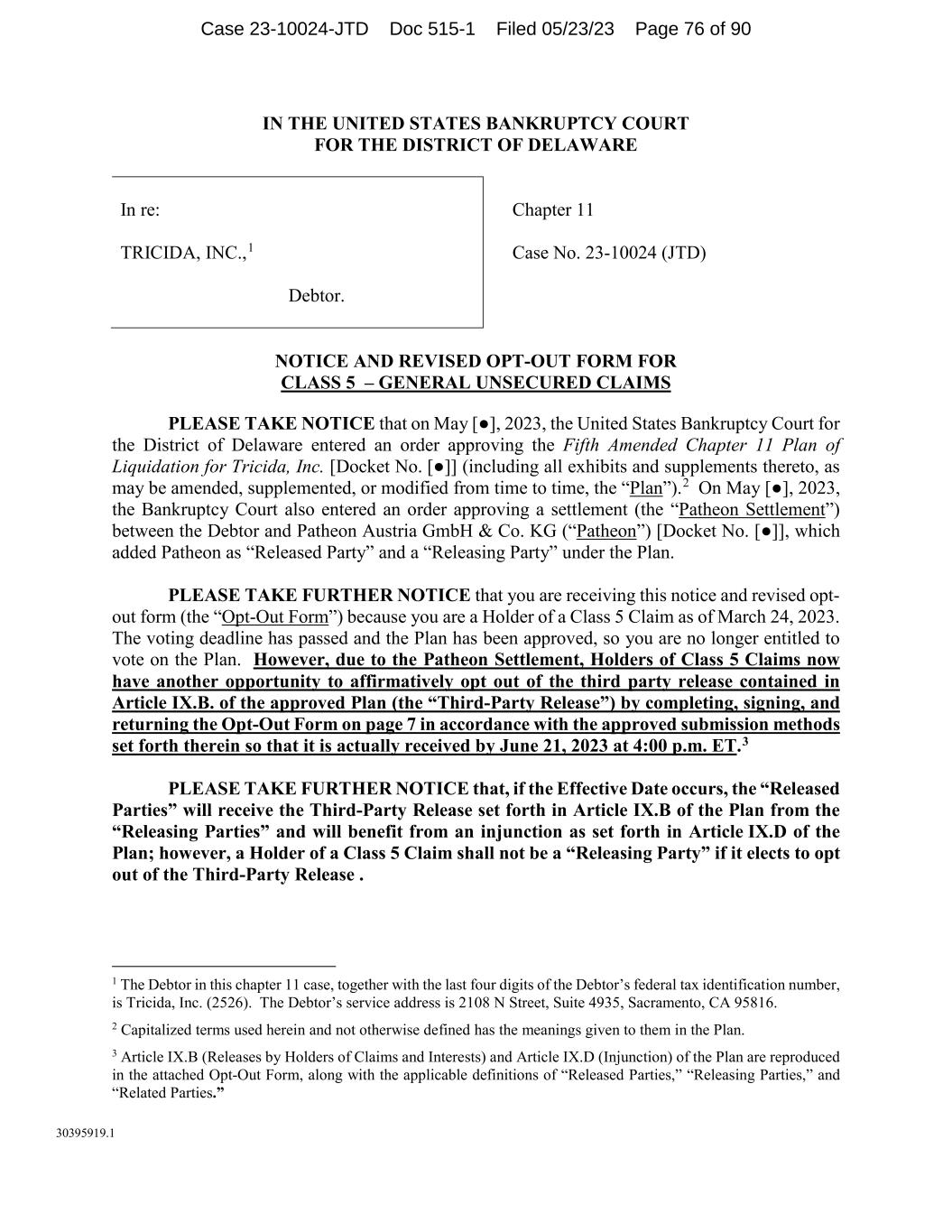 30395919.1 IN THE UNITED STATES BANKRUPTCY COURT FOR THE DISTRICT OF DELAWARE In re:TRICIDA,INC.,1 Debtor。第11章案件编号23-10024(JTD)NOTICE AND REVISED OPT-OUT FORM FOR CLASS5 – General Unsecured CLAIMS PLEASE TAKE NOTICE that May [ ● ],2023,the United States Bankruptcy Court for the District of Delaware invested an order,approving the Fifth Amended Chapter 11 Plan of Liquidation for Tricida, Inc. [ Docket No. ]。[ ● ] ](包括可能不时修订、补充或修改的“计划”的所有证物及其补充)。22023年5月[ ● ],破产法院还下达命令,批准债务人与Patheon Austria GmbH & Co. KG(“Patheon”)之间的和解(“Patheon和解”)[案卷编号。[ ● ] ],根据该计划,Patheon被添加为“释放党”和“释放党”。请进一步注意,您收到此通知和修改后的选择退出表格(“选择退出表格”),因为截至2023年3月24日,您是第5类索赔的持有人。投票截止日期已过,该计划已获批准,因此你不再有权就该计划投票。然而,由于Patheon和解协议,第5类索赔的持有人现在有另一个机会明确地选择退出批准计划第IX.B条所载的第三方释放(“第三方释放”),方法是按照其中规定的批准提交方法填写、签署并返回第7页的选择退出表格,以便在美国东部时间2023年6月21日下午4:00之前实际收到。3请进一步注意,如果生效日期发生,“被解放方”将从“解放方”获得计划第IX.B条规定的第三方解放方,并将受益于计划第IX.D条规定的强制令;但是,如果第5类债权持有人选择退出第三方解放方,则不应成为“解放方”。1第11章案件中的债务人,连同债务人联邦税号的最后四位数字,是Tricida, Inc.(2526)。债务人的服务地址是2108 N Street,Suite 4935,Sacramento,加利福尼亚州 95816。2此处使用的、未另行定义的大写术语具有本计划赋予它们的含义。3本计划第IX.B条(债权和权益持有人的解除)和第IX.D条(禁止令)载于所附的选择退出表格,以及适用的“解除方”、“解除方”和“相关方”的定义。判例23-10024-JTD Doc 515-1提交05/23/23第76页,共90页