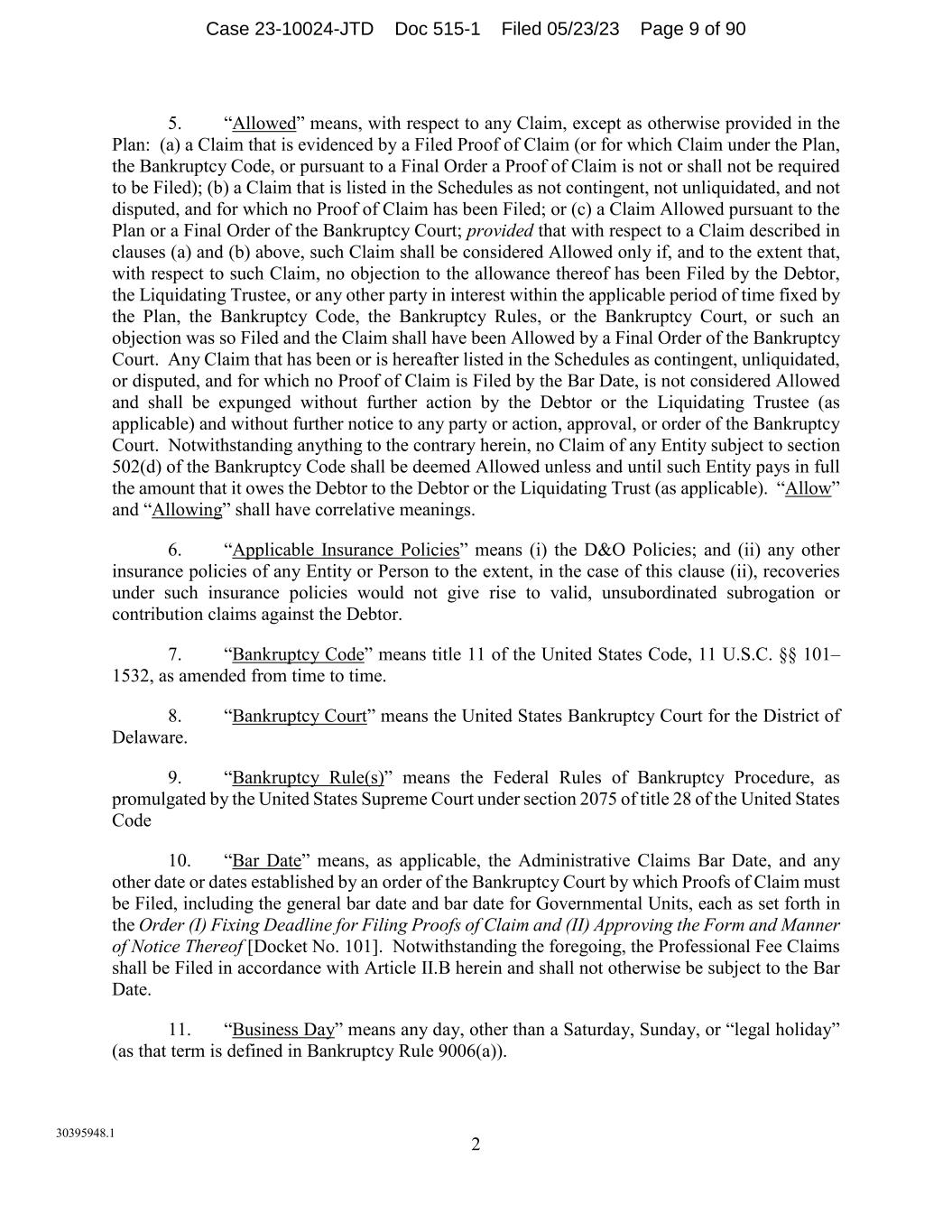 2 30395948.1 5.就任何债权而言,除计划另有规定外,“准许”是指:(a)以已提交的债权证明为证据的债权(或根据计划、《破产法》或根据最终命令未提交或不应要求提交债权证明的债权);(b)附表中列出的非或有的、非未清算且无争议的债权,(c)根据本计划或破产法院的最后命令而获准许的申索;但就上文(a)及(b)条所述的申索而言,只有在债务人、清盘受托人或任何其他利益方在本计划、《破产法》及《破产规则》所订定的适用期限内,并在就该申索而言并无对该申索的准许提出异议的情况下,该项申索才视为获准许,或破产法院,或该等反对已如此提出,而该索偿已获破产法院的最终命令准许。任何在附表中已经或以后被列为或有事项、未清算或有争议的债权,而在破产日期之前没有提交债权证明的债权,均被视为不被允许,并且应在债务人或清算受托人(视情况而定)不采取进一步行动的情况下予以删除,也无须向任何一方发出进一步通知,也无须向破产法院作出行动、批准或命令。尽管本条例另有相反规定,任何实体在不违反《破产法》第502(d)条的情况下提出的索偿要求,不得视为准许,除非及直至该实体向债务人或清算信托(视情况而定)支付其欠债务人的全部款项为止。“允许”和“允许”应具有相关含义。6.“适用保单”是指(i)D & O保单;以及(ii)任何实体或个人的任何其他保单,但在本条款(ii)的情况下,此类保单下的追偿不会导致针对债务人的有效的、非次级的代位权或分担索赔。7.“破产法”指的是美国法典第11章,U.S.C. § § 101 – 1532,不时修订。8.“破产法院”指的是美国特拉华州破产法院。9.“破产规则”是指美国最高法院根据《美国法典》第10章第28条第2075节颁布的《联邦破产程序规则》。“截止日期”是指(如适用的话)行政索赔截止日期,以及破产法院的命令所规定的任何其他日期,其中必须提交索赔证明,包括政府单位的一般截止日期和截止日期,每一日期都在命令(I)确定提交索赔证明的截止日期和(II)批准其通知的形式和方式[案卷第101号]中规定。尽管有上述规定,专业费用索赔应按照本条款第二.B条提交,否则不受律师资格日期的限制。11.“营业日”是指除周六、周日或“法定假日”(破产规则第9006(a)条对该术语的定义)以外的任何一天。案例23-10024-JTD Doc 515-1提交05/23/23第9页,共90页