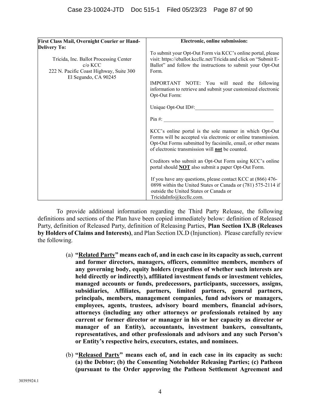 430395924.1头等舱邮件,隔夜快递或手提送达:Tricida, Inc.选票处理中心c/o KCC 222 N. Pacific Coast Highway,Suite 300 El Segundo,加利福尼亚州 90245电子,在线提交:要通过KCC的在线门户提交您的选择退出表格,请访问:https://eballot.kccllc.net/Tricida并点击“提交电子选票”并按照说明提交您的选择退出表格。重要提示:您将需要以下信息来检索和提交您定制的电子选择退出表格:唯一选择退出ID #:_________________________________ Pin #:_________________________________________ KCC的在线门户网站是通过电子或在线传输接受选择退出表格的唯一方式。通过传真、电子邮件或其他电子传输方式提交的选择退出表格将不被计算在内。通过KCC的在线门户网站提交选择退出表格的债权人不应同时提交纸质选择退出表格。如有任何疑问,请在美国或加拿大境内致电(866)476-0898与KCC联系,如在美国或加拿大境外,请致电(781)575-2114与KCC联系,或发送电子邮件至TricidaInfo@kccllc.com。为提供有关第三方释放的更多信息,现将计划的以下定义和章节立即复制如下:释放方的定义、释放方的定义、释放方的定义、计划部分IX.B(债权和权益持有人的释放)和计划部分IX.D(禁令)。请仔细审查以下内容。(a)“关联方”是指现任和前任董事、经理、高级职员、委员会成员、任何理事机构的成员、股东(不论这些权益是直接持有还是间接持有)、关联投资基金或投资工具、管理账户或基金、前任、参与者、继任者、受让人、子公司、关联公司、合伙人、有限合伙人、普通合伙人、委托人、成员、管理公司、基金顾问或经理、雇员、代理人、受托人、顾问委员会成员、财务顾问,律师(包括任何现任或前任董事或经理以实体董事或经理的身份聘用的任何其他律师或专业人员)、会计师、投资银行家、顾问、代表、其他专业人员和顾问以及任何此类人员或实体各自的继承人、遗嘱执行人、遗产和被提名人。(b)“解除担保方”是指(a)债务人;(b)同意的票据持有人解除担保方;(c)Patheon(根据批准Patheon和解协议的命令和案件23-10024-JTD Doc 515-1提交05/23/23第87页,共90页
