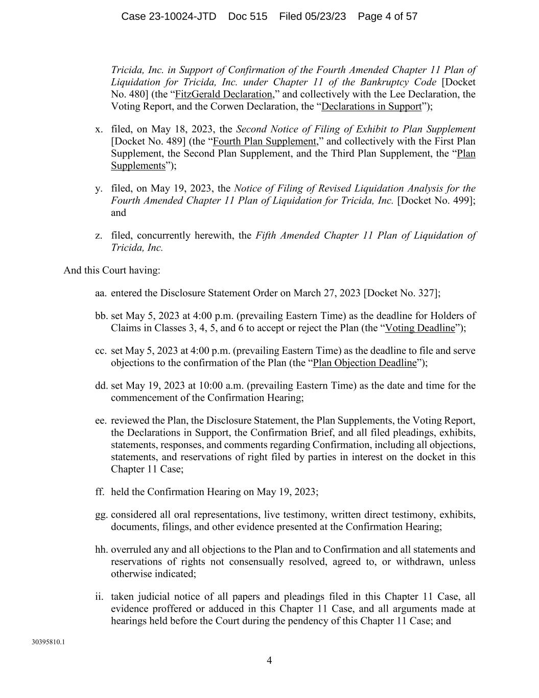 430395810.1 Tricida公司支持确认根据《破产法》第11章对Tricida公司进行第四次修订的第11章清算计划[案卷第480号](“FitzGerald声明”,与Lee声明、投票报告和Corwen声明合称“支持声明”);x.于2023年5月18日提交了第二次提交附件计划补充文件的通知[案卷第489号](“第四次计划补充文件”,并与第一份计划补充文件、第二份计划补充文件和第三份计划补充文件合称为“计划补充文件”);y.于2023年5月19日提交了Tricida, Inc.第四份经修订的第11章清算计划的修订清算分析备案通知[案卷编号499 ];z.同时提交了Tricida, Inc.第五份经修订的第11章清算计划,本法院于2023年3月27日提交了披露声明令[案卷编号327 ];b.定于5月5日提交,2023年下午4:00(美国东部时间)为第3、4、5、6类债权持有人接受或否决计划的截止日期(“投票截止日期”);cc将2023年5月5日下午4:00(美国东部时间)为提交和送达对计划确认的异议的截止日期(“计划异议截止日期”);dd.将2023年5月19日上午10:00(美国东部时间)为确认听证会开始的日期和时间;e.审查了计划、披露声明、计划补充、投票报告、支持声明,确认书,以及所有提交的关于确认书的书状、证物、陈述、答复和评论,包括与本第11章案件案卷上的利益相关方提出的所有反对、陈述和权利保留;于2023年5月19日举行了确认书听证会;审议了确认书听证会上提出的所有口头陈述、现场证词、书面直接证词、证物、文件、文件和其他证据;hh.驳回对计划和确认书的任何和所有反对,以及对未经双方同意解决、同意或撤回的权利的所有陈述和保留,除非另有说明,否则已就在本第11章案件中提交的所有文件和书状、在本第11章案件中提供或援引的所有证据,以及在本第11章案件待决期间在本法院举行的听证会上提出的所有论点,收到司法通知;以及案件23-10024-JTD Doc 515提交05/23/23第4页,共57页