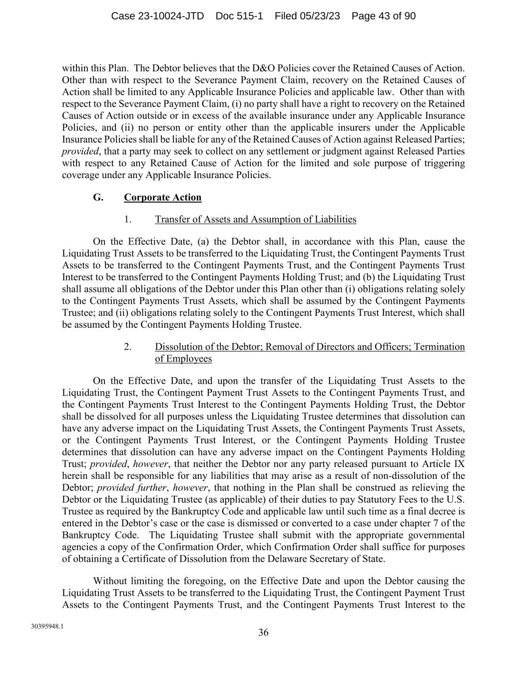 本计划内的3630395948.1。债务人认为,D & O政策涵盖了保留的诉讼理由。除遣散费索偿外,对保留诉讼因由的追讨应限于任何适用的保险单和适用的法律。除遣散费索偿外,(i)任何一方均无权在任何适用保险单下的可用保险之外或超出任何适用保险单下的可用保险的范围内,就保留的诉讼因由要求赔偿;(ii)除适用保险单下的适用保险人外,任何人或实体均不得对任何保留的针对被解除当事人的诉讼因由承担赔偿责任,但前提是,一方当事人可寻求就任何保留的诉讼因由对被解除当事人作出的任何和解或判决收取费用,其目的仅限于触发任何适用保险单的承保范围。G.公司行动1。在生效日期,(a)债务人应按照本计划安排将清算信托资产转移至清算信托,或有付款信托资产转移至或有付款信托,或有付款信托利息转移至或有付款持有信托;(b)清算信托应承担债务人在本计划下的所有义务,但(i)仅与或有付款信托资产有关的义务除外,(二)仅与或有付款信托利息有关的债务,应由或有付款受托人承担。2.债务人的解散;董事和高级职员的免职;雇员的终止于生效日期,在清算信托资产转移至清算信托、或有付款信托资产转移至或有付款信托、或有付款信托利息转移至或有付款持有信托时,债务人应为所有目的而解散,除非清算受托人确定解散可能对清算信托资产、或有付款信托资产或或有付款信托利息产生任何不利影响,或或有付款控股受托人确定,解散可能对或有付款控股信托产生任何不利影响;但债务人或根据本条第九条解除的任何一方均不应对因债务人不解散而可能产生的任何责任负责;但进一步规定,本计划不得解释为免除债务人或清算受托人(如适用)按照《破产法》和适用法律的要求向美国受托人支付法定费用的责任,直至债务人的案件被作出最终裁定,或案件被驳回或根据《破产法》第7章被转换为案件为止。清算受托人应向有关政府机构提交确认令副本,确认令应足以从特拉华州国务卿处获得解散证书。在不限制上述规定的情况下,自生效之日起,债务人将清算信托资产转移至清算信托,或有付款信托资产转移至或有付款信托,或有付款信托利息转移至案件23-10024-JTD Doc 515-1提交05/23/23第43页,共90页