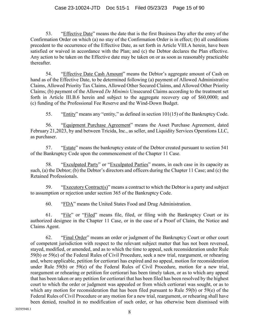 8 30395948.1 53.“生效日期”是指确认令生效后的第一个营业日,在该营业日(a)确认令没有中止生效;(b)本文第VII.A条规定的生效日期发生的所有先决条件均已按照本计划得到满足或豁免;以及(c)债务人宣布本计划生效。在生效日期须采取的任何行动,可于生效日期当日或其后在合理切实可行的范围内尽快采取。54.“生效日期现金金额”是指债务人截至生效日期的手头现金总额,将在以下情况下确定:(a)支付允许的行政债权、允许的优先权税收债权、允许的其他有担保债权和允许的其他优先权债权;(b)按照本条款第III.B.6条规定的处理方式支付允许的最低无担保债权,并受制于60,0000美元的总追偿上限;(c)为专业费用储备金和逐渐减少的预算提供资金。55.“实体”指《破产法》第101(15)条所定义的任何“实体”。56.“设备购买协议”是指Tricida, Inc.作为卖方与流动性服务运营有限责任公司作为买方于2023年2月21日签署的资产购买协议。57.“破产财产”是指债务人在第11章案件开始时根据《破产法》第541条设立的破产财产。58.在每一种情况下,“被免责方”或“被免责方”是指(a)债务人;(b)在第11章案件期间债务人的董事和高级管理人员;(c)留用的专业人员。59.“执行合同”是指债务人作为一方当事人的合同,根据《破产法》第365条,该合同可能会被承担或拒绝。60.“FDA”指的是美国食品药品监督管理局。61.“归档”或“归档”是指在第11章案件中向破产法院或其授权指定人提交、归档或归档的文件,或者在索赔证明、通知和索赔代理的情况下。62.“终审命令”是指破产法院或其他有管辖权的法院就相关标的事项作出的命令或判决,该命令或判决尚未被推翻、中止、修改或修正,就该命令或判决提出上诉的时间,根据《联邦民事诉讼规则》第59(b)或59(e)条寻求复议,寻求重新审判、重新辩论或重新审理,并在适用的情况下,请求调阅的申请已过期,没有上诉,根据《联邦民事诉讼规则》第59(b)或59(e)条要求重新审议的动议,重新审判的动议,重新辩论、重新辩论或重新辩论或重新辩论的请求均已及时提出,或已提出的任何上诉或已提出的任何重新辩论的请求均已由对该命令或判决提出上诉的最高法院解决,或已向其寻求重新辩论的请求,或已根据《联邦民事诉讼规则》第59条(b)款或第59条(e)款提出的任何重新审议请求或重新辩论或重新辩论的请求均应被驳回,但不会导致对该命令的任何修改,或已以其他方式与案件23-10024-JTD Doc 515-1被驳回提交05/23/23第15页