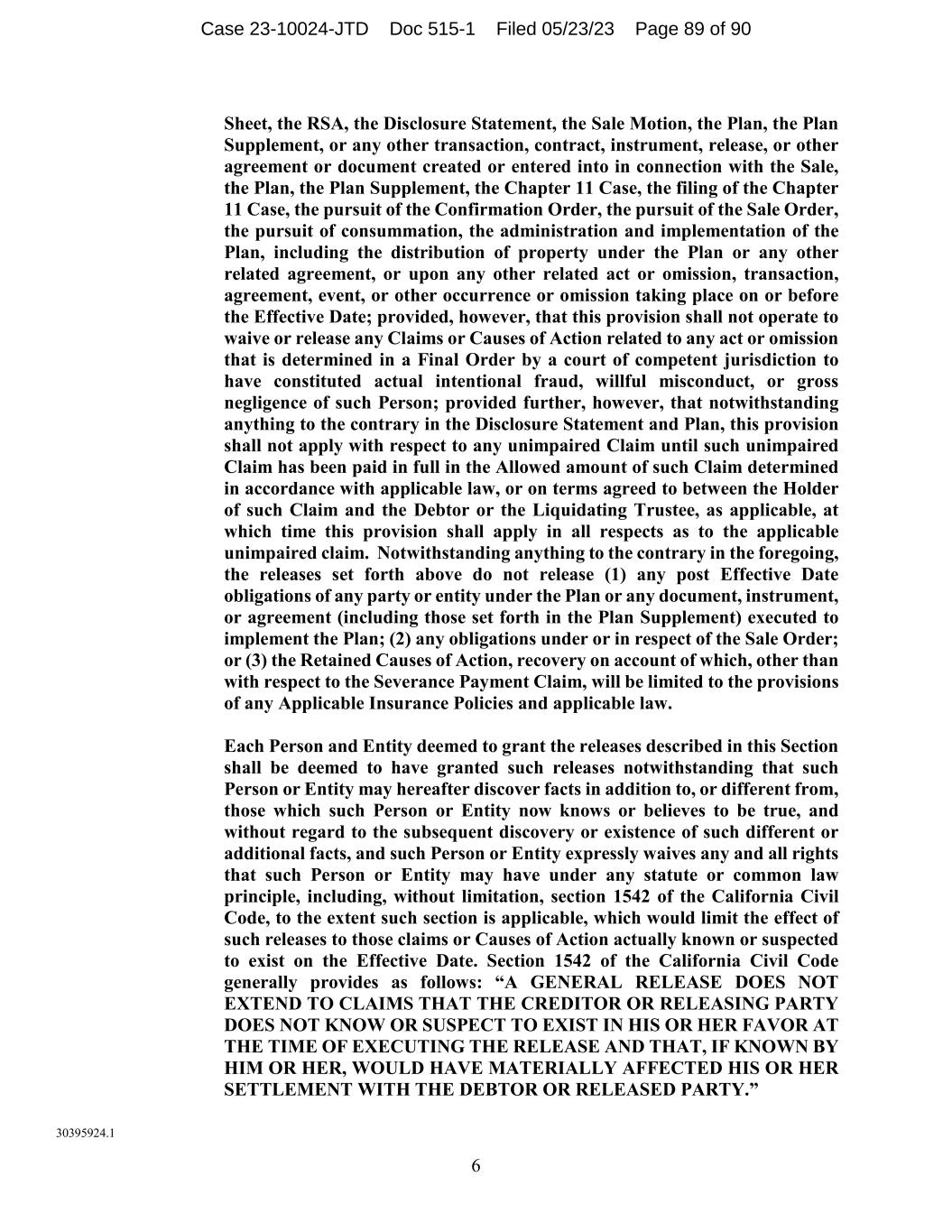 630395919.1表格、RSA、披露声明、出售动议、计划、计划补充或与出售、计划、计划补充、第11章案件、提交第11章案件、执行确认令、执行出售令、执行计划、管理和实施计划有关的任何其他交易、合同、文书、解除或其他协议或文件,包括根据计划或任何其他相关作为或不作为、交易、协议,在生效日期当日或之前发生的事件或其他发生或不作为;但本条文的作用不应是免除或解除与任何行为或不作为有关的任何索赔或诉讼因由,而该行为或不作为是由主管司法管辖权的法院在《最后命令》中裁定构成该人的实际故意欺诈、故意不当行为或重大过失的;但进一步规定,即使《披露声明和计划》中有任何相反的规定,本条文不适用于任何未受损害的索偿,直至该未受损害的索偿已按根据适用法律所厘定的该等索偿的容许款额,或按该等索偿的持有人与债务人或清盘受托人(如适用)所议定的条款,付清为止,而在该等情况下,本条文在所有方面均适用于该适用的未受损害索偿。尽管上述规定有任何相反的规定,上述解除并不解除(1)任何一方或实体根据本计划或为执行本计划而签立的任何文件、文书或协议(包括本计划补充文件所列的文件、文书或协议)所承担的任何生效日期后的义务;(2)根据售货令或就售货令所承担的任何义务;或(3)保留的诉讼因由,除与遣散费索偿有关外,其追讨将限于任何适用的保险单和适用的法律的规定。被视为准予实施本节所述的释放的每个人和实体,应被视为已准予实施此种释放,即使该个人或实体以后可以发现除该个人或实体现在知道或认为是真实的事实之外的事实或与之不同的事实,且不考虑随后发现或存在此种不同或额外的事实,且该个人或实体明确放弃该个人或实体根据任何成文法或普通法原则可能拥有的任何和所有权利,包括但不限于,在适用的范围内,《加利福尼亚民法典》第1542条将把这种释放的影响限制于在生效日期实际已知或怀疑存在的那些要求或诉讼理由。《加利福尼亚民法典》第1542条一般规定如下:“一般释放不适用于声称债权人或释放方在执行释放时不知道或怀疑以他或她的名义存在,并且如果他或她知道,将对他或她与债务人或释放方的和解产生重大影响。”判例23-10024-JTD Doc 515-1提交05/23/23第81页,共90页