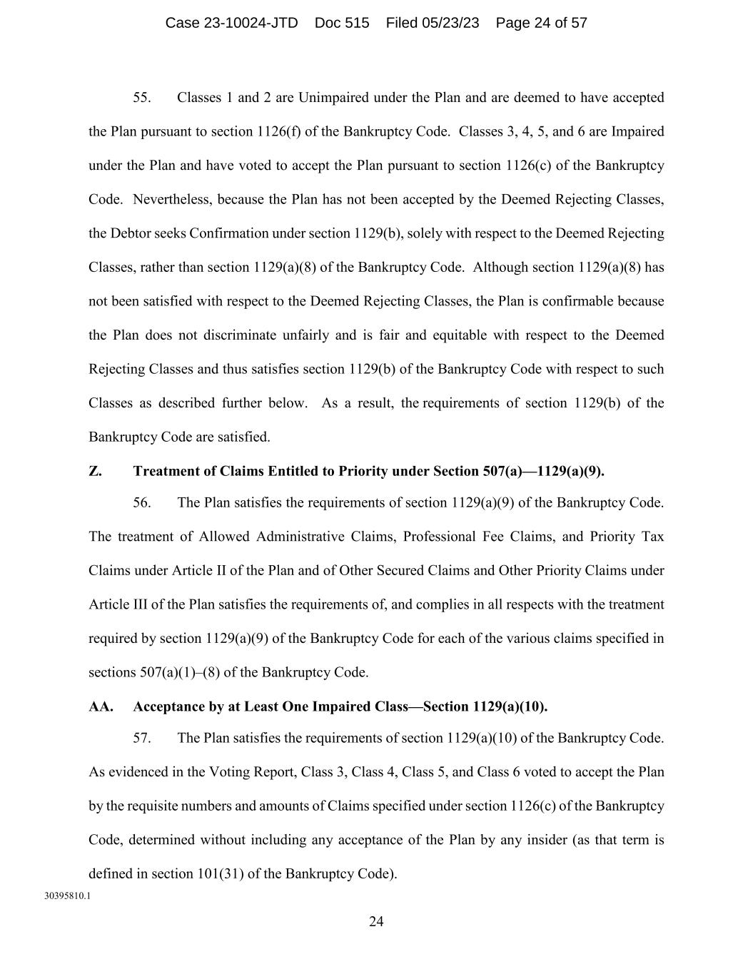 24 30395810.1 55.根据《破产法》第1126(f)条,第1类和第2类在该计划下未受损害,并被视为已接受该计划。第3类、第4类、第5类和第6类在该计划下受到损害,并已根据《破产法》第1126(c)条投票接受该计划。然而,由于该计划未获视为拒绝类别接受,债务人只就视为拒绝类别而非《破产法》第1129(a)(8)条,寻求根据第1129(b)条予以确认。虽然第1129(a)(8)条并不满足于被视为拒绝的类别,但该计划是可以确认的,因为该计划并无不公平的歧视,而且就被视为拒绝的类别而言是公平和公平的,因此符合《破产法》第1129(b)条关于下文进一步描述的此类类别的规定。因此,《破产法》第1129(b)节的要求得到满足。Z.第507(a)— 1129(a)(9)节规定的享有优先权的债权的处理。56.该计划符合《破产法》第1129(a)(9)条的规定。本计划第二条下的准许行政债权、专业费用债权和优先权税收债权以及本计划第三条下的其他有担保债权和其他优先权债权的处理,符合《破产法》第1129(a)(9)条对《破产法》第507(a)(1)–(8)条规定的各项债权的要求,并在所有方面符合《破产法》第1129(a)(9)条的要求。AA。至少一个受损阶层的接受——第1129(a)(10)条。57.该计划符合《破产法》第1129(a)(10)条的规定。正如投票报告所证明的,第3类、第4类、第5类和第6类按《破产法》第1126(c)条规定的必要数量和债权数额投票接受该计划,但不包括任何内部人士对该计划的接受(该术语在《破产法》第101(31)条中定义)。判例23-10024-JTD Doc 515提交05/23/23第24页,共57页