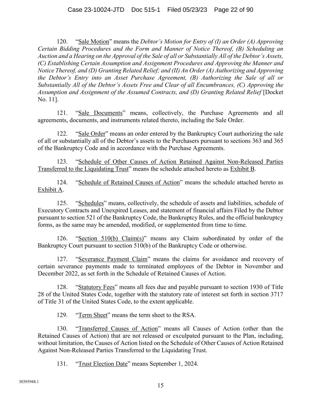 15 30395948.1 120.“出售动议”是指债务人提出的以下请求:(一)命令(A)批准某些投标程序及其通知的形式和方式,(B)安排拍卖和听证会,批准出售债务人的全部或几乎全部资产,(C)建立某些假设和转让程序并批准其方式和通知,以及(D)给予相关救济;(二)命令(A)授权和批准债务人签订资产购买协议,(B)授权出售债务人的全部或几乎全部资产,不附带任何产权负担;(C)批准假定合同的承担和转让;(D)给予相关救济[案卷第11号]。121.“销售文件”是指采购协议和所有与之相关的协议、文件和文书的统称,包括销售订单。122.“出售令”是指破产法院根据《破产法》第363和365条并根据购买协议,授权将债务人的全部或几乎全部资产出售给买方的命令。123.“针对未被解押方转移至清算信托而保留的其他诉讼理由的附表”是指作为附件 B. 124附在本文件之后的附表。“保留诉讼理由附表”是指作为附件 A.125所附的附表。“附表”是指债务人根据《破产法》第521条、《破产规则》和正式的破产表格提交的资产和负债明细表、执行合同和未到期租约明细表、财务报表,这些报表可能会不时修改、修改或补充。126.“第510(b)条索赔”是指根据《破产法》第510(b)条或其他规定,由破产法院命令从属的任何索赔。127.“遣散费索赔”是指要求撤销和追回在2022年11月和12月支付给债务人被解雇雇员的某些遣散费的索赔,如保留诉讼因由附表所述。128.“法定费用”是指根据《美国法典》第28章第1930条规定应支付的所有费用,以及适用范围内《美国法典》第31章第3717条规定的法定利率。129.“条款清单”指的是RSA的条款清单。130.“转移诉讼因由”是指根据该计划未被解除或未被免除责任的所有诉讼因由(保留诉讼因由除外),包括但不限于被转移至清算信托的针对未被解除的当事人的其他保留诉讼因由附表所列的诉讼因由。131.“信托选举日期”指的是2024年9月1日。判例23-10024-JTD Doc 515-1提交05/23/23第22页,共90页