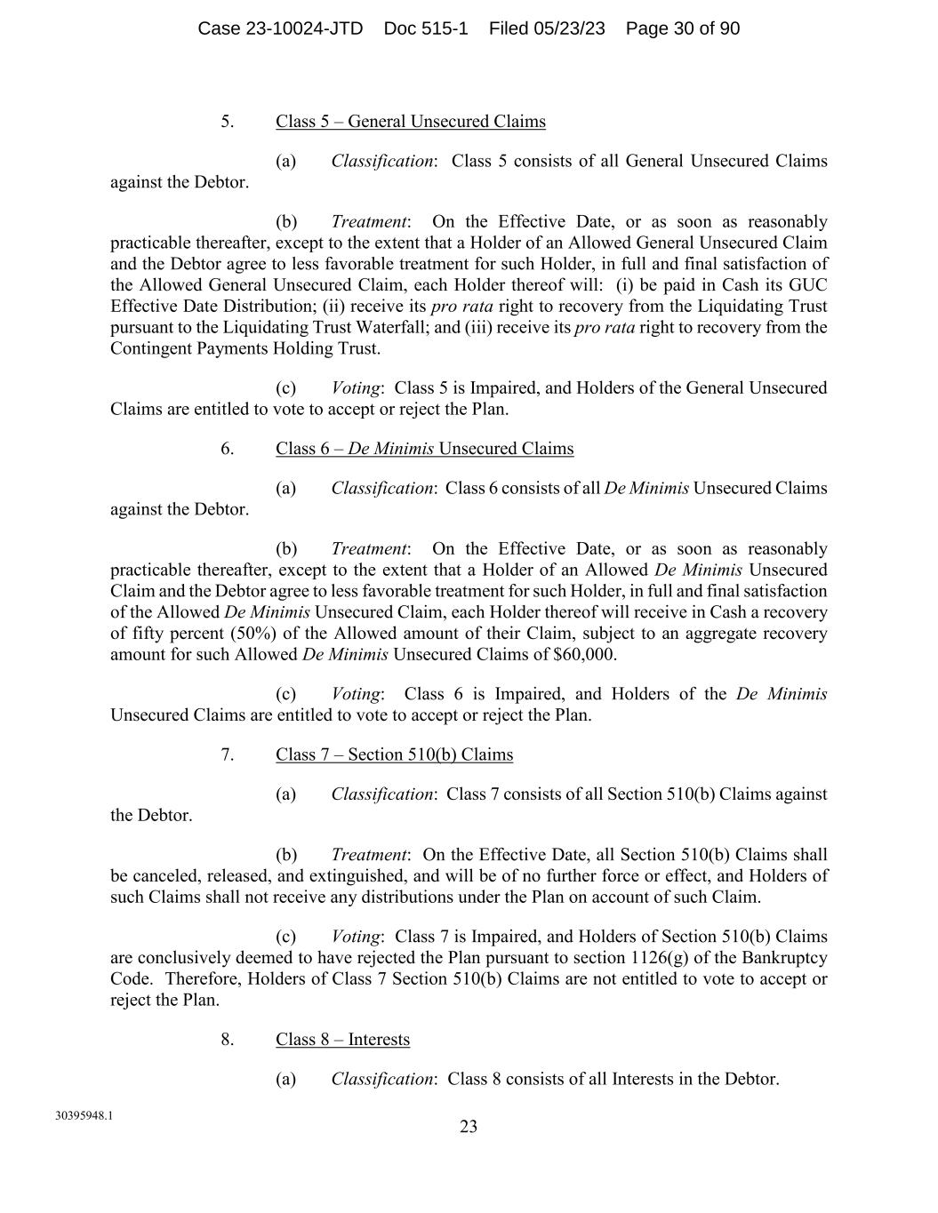 23 30395948.1 5.第5类–一般无担保债权(a)分类:第5类包括针对债务人的所有一般无担保债权。(b)处理:在生效日期,或在其后合理可行的范围内尽快处理,除非准许的一般无担保债权的持有人与债务人同意对该持有人给予较低的优惠待遇,以完全和最终清偿准许的一般无担保债权,其每一持有人将:(i)以现金支付其GUC生效日期分配;(ii)根据清算信托瀑布获得其按比例从清算信托收回的权利;(iii)获得其按比例从或有付款持有信托收回的权利。(c)投票:第5类受损,一般无担保债权持有人有权投票接受或否决该计划。6.第6类– De Minimis无担保债权(a)分类:第6类包括针对债务人的所有De Minimis无担保债权。(b)处理:自生效之日起,或在其后合理可行的范围内尽快,除非准许最低无担保债权的持有人和债务人同意对该持有人给予较低的优惠待遇,以完全和最终清偿准许最低无担保债权,其每一持有人将以现金形式获得其债权允许金额的百分之五十(50%)的补偿,但此种准许最低无担保债权的总补偿金额为60000美元。(c)投票:第6类受损,De Minimis无担保债权持有人有权投票接受或否决该计划。7.第7类–第510(b)节债权(a)分类:第7类包括所有第510(b)节对债务人的债权。(b)处理:自生效之日起,所有第510(b)条的索赔应予取消、释放和消灭,不再具有任何效力或效力,此种索赔的持有人不得因此种索赔而根据本计划获得任何分配。(c)投票:第7类受损,第510(b)条的债权人根据《破产法》第1126(g)条被认定为否决了该计划。因此,第7类第510(b)条索赔的持有人无权投票接受或否决该计划。8.第8类–权益(a)分类:第8类包括债务人的所有权益。判例23-10024-JTD Doc 515-1提交05/23/23第30页,共90页