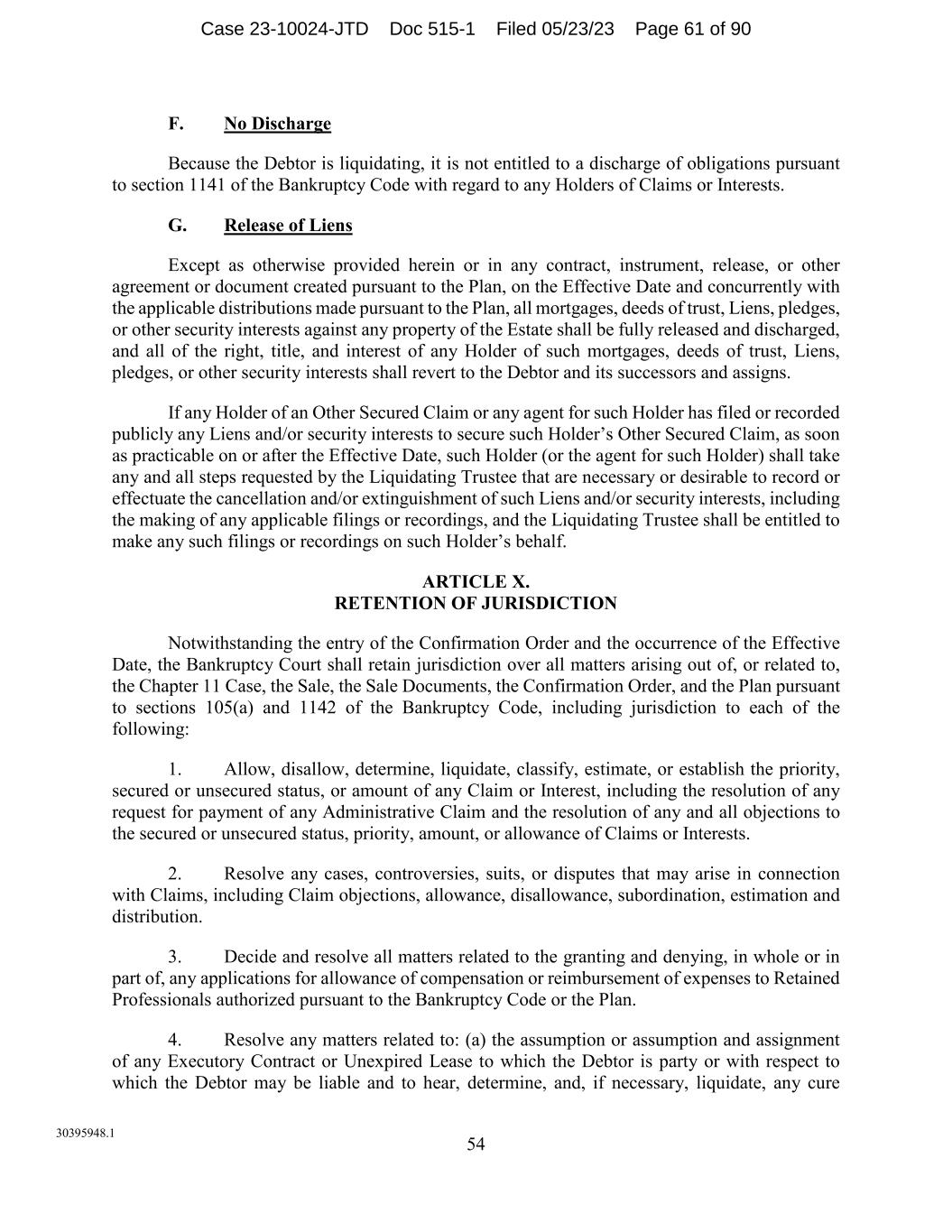 5430395948.1 F.不解除债务由于债务人正在清算,根据《破产法》第1141条,债务人无权要求对任何债权或权益持有人解除债务。G.除本协议或根据本计划订立的任何合同、文书、解除或其他协议或文件另有规定外,在生效之日并与根据本计划作出的适用分配同时,所有抵押、信托契据、留置权、质押或针对遗产任何财产的其他担保权益均应全部解除和解除,此类抵押、信托契据、留置权、质押或其他担保权益的任何持有人的所有权利、所有权和权益应归还债务人及其继承人和受让人。其他有担保债权的任何持有人或该持有人的任何代理人,如在生效日期当日或之后,在切实可行范围内尽快公开提交或记录任何留置权和/或担保权益,以担保该持有人的其他有担保债权,则该持有人(或该持有人的代理人)应采取清算受托人要求的一切必要或可取的步骤,以记录或实现该等留置权和/或担保权益的取消和/或消灭,包括制作任何适用的文件或记录,而清盘受托人有权代表该持有人作出任何该等存档或录音。第十条保留管辖权尽管确认令已经生效,但根据《破产法》第105(a)条和第1142条,破产法院仍应保留对第11章案件、出售、出售文件、确认令和计划引起或与之相关的所有事项的管辖权,包括对以下每一项的管辖权:1。允许、不允许、确定、清算、分类、估计或确定任何债权或利息的优先权、有担保或无担保地位或数额,包括解决任何要求支付任何行政债权的请求,以及解决对债权或利息的有担保或无担保地位、优先权、数额或允许的任何和所有异议。2.解决与索赔有关的任何案件、争议、诉讼或争议,包括索赔异议、津贴、不允许、排序居次、估计和分配。3.决定和解决与批准和拒绝全部或部分根据《破产法》或《计划》授权向留用专业人员申请补偿津贴或报销费用有关的所有事项。4.解决与下列事项有关的任何事项:(a)承担或承担和转让债务人作为当事方或债务人可能对其负有责任的任何已执行合同或未到期租赁,并听取、确定并在必要时清算任何补救措施案例23-10024-JTD Doc 515-1提交05/23/23第61页,共90页