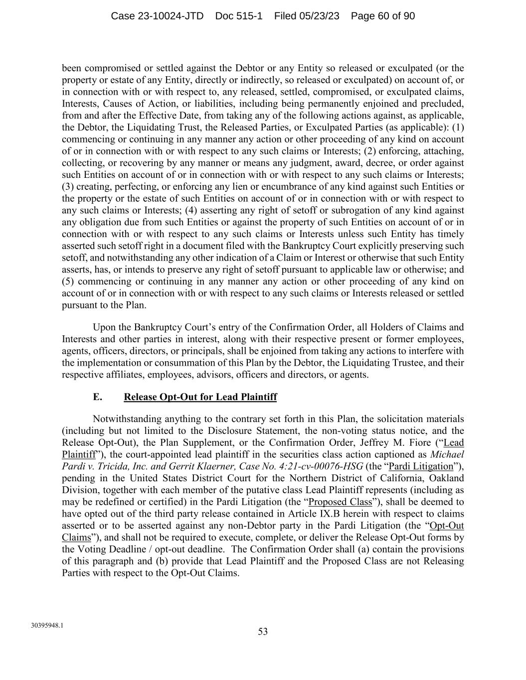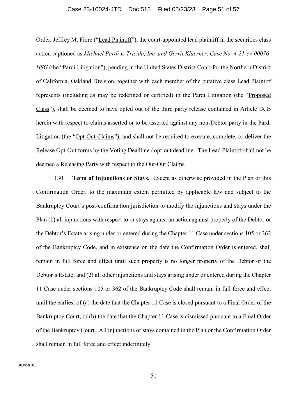 5130395810.1命令,Jeffrey M. Fiore(“首席原告”),法院指定的证券集体诉讼的首席原告,案件标题为Michael Pardi诉Tricida公司和Gerrit Klaerner,案件编号4:21-cv-00076-HSG(“Pardi诉讼”),在美国加利福尼亚州北区联邦地区法院奥克兰分部待决,连同首席原告在Pardi诉讼(“拟议集体”)中所代表的(包括可能被重新定义或认证的)推定集体的每个成员,对于在Pardi诉讼中针对任何非债务方主张或将要主张的债权(“选择-退出债权”),应被视为已选择退出本条款第IX.B条所载的第三方解除债权,并且不应被要求在投票截止日期/选择-退出截止日期之前执行、填写或交付解除选择-退出表格。首席原告不应被视为就退出索赔而言的释放方。130.禁止令或逗留期限。除本计划或本确认令另有规定外,在适用法律允许的最大限度内,并在符合破产法院的确认后司法管辖权的情况下,修改本计划(1)所订的强制令,并根据《破产法》第105或362条,对根据破产法第11章案件产生的或在该案件期间进入的针对债务人财产或债务人遗产的诉讼作出的所有强制令或中止,并在确认令生效之日有效,(2)根据《破产法》第105或362条在第11章案件中根据第11章案件产生或订立的所有其他强制令和中止,在(a)第11章案件根据破产法院的最终命令结案的日期,或(b)第11章案件根据破产法院的最终命令被驳回的日期中最早的日期之前,保持完全有效。本计划或确认令所载的所有强制令或中止,均须无限期地保持完全有效。判例23-10024-JTD Doc 515提交05/23/23第51页,共57页