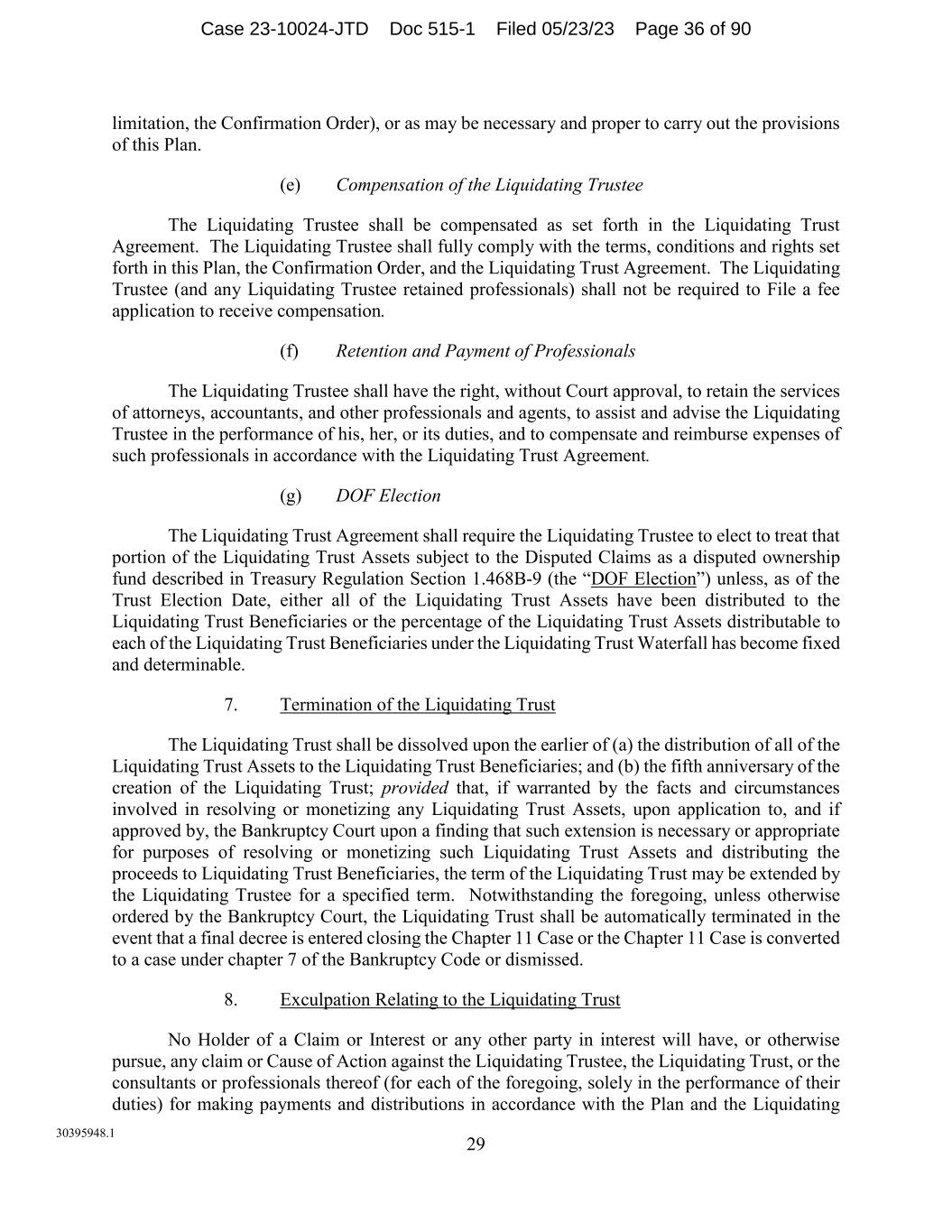 2930395948.1限制,确认令),或为执行本计划的规定而可能需要和适当的。(e)清算受托人的补偿清算受托人应按《清算信托协议》的规定获得补偿。清算受托人应完全遵守本计划、确认令和清算信托协议中规定的条款、条件和权利。清盘受托人(及任何清盘受托人聘用的专业人士)无须提出收费申请以获得补偿。(f)专业人员的留用和支付清算受托人有权在未经法院批准的情况下保留律师、会计师和其他专业人员及代理人的服务,协助清算受托人履行其职责并向其提供建议,并根据清算信托协议补偿和偿还这些专业人员的费用。(g)自由度选择清算信托协议应要求清算受托人选择将受争议债权约束的那部分清算信托资产视为财政部条例第1.468B-9节中所述的有争议所有权基金(“自由度选择”),除非在信托选举日,所有清算信托资产已分配给清算信托受益人,或清算信托瀑布下可分配给每个清算信托受益人的清算信托资产的百分比已固定且可确定。7.清算信托的终止清算信托应于(a)将清算信托资产全部分配给清算信托受益人;及(b)清算信托成立五周年时(以较早者为准)解散,但在清算信托资产或将清算信托资产货币化所涉及的事实和情况所证明的情况下,经向破产法院提出申请,并经破产法院裁定,为解决清算信托资产或将其货币化以及将收益分配给清算信托受益人的目的,此种延期是必要或适当的,清算信托的期限可由清算受托人延长一段规定的期限。尽管有上述规定,除非破产法院另有命令,否则,如果对第11章案件作出最后裁定,或第11章案件根据《破产法》第7章被转换为案件或被驳回,清算信托应自动终止。8.与清盘信托有关的免责声明任何债权或权益的持有人或任何其他利益方均不会因根据计划及清盘个案23-10024-JTD Doc 515-1作出付款及分配而向清盘受托人、清盘信托或其顾问或专业人士提出或以其他方式提出任何债权或诉讼因由(就上述各项而言,仅限于履行其职责)