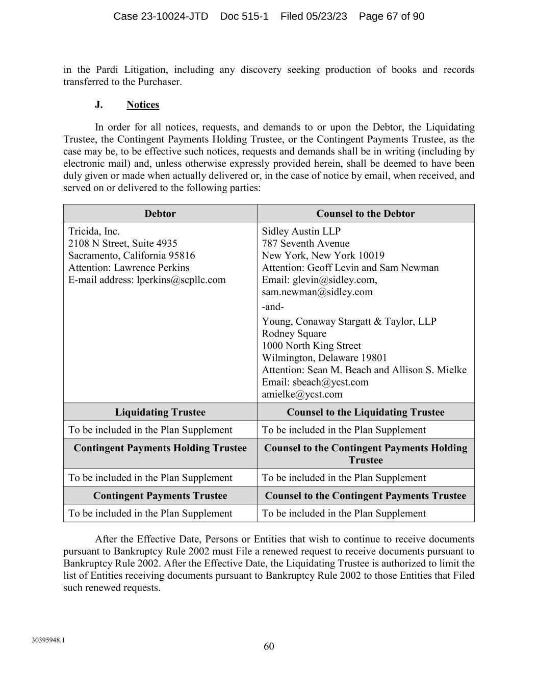 6030395948.1在Pardi诉讼案中,包括要求出示转让给买方的簿册和记录的任何发现。J.通知为使向债务人、清算受托人、持有或有付款的受托人或或有付款的受托人(视情况而定)发出的所有通知、请求和要求生效,这些通知、请求和要求应以书面形式(包括通过电子邮件)提出,除非本协议另有明文规定,否则在实际送达时,或在通过电子邮件发出通知的情况下,在收到时,应视为已妥为发出或作出,并已送达或交付给以下各方:债务人Tricida, Inc.北大街2108号的债务人律师,Suite 4935 Sacramento,California 95816收件人:Lawrence Perkins电子邮件地址:lperkins@scpllc.com Sidley Austin LLP 787 Seventh Avenue New York,New York 10019收件人:Geoff Levin和Sam Newman电子邮件:glevin@sidley.com,sam.newman@sidley.com-和-Young,Conaway Stargatt & Taylor,LLP Rodney Square 1000 North King Street Wilmington,特拉华州19801收件人:Sean M. Beach和Allison S. Mielke电子邮件:sbeach@ycst.com amielke@ycst.com清算受托人的清算受托人法律顾问将被纳入计划补充将被纳入计划补充或有付款持有受托人或有付款持有受托人的法律顾问将被纳入计划补充将被纳入计划补充或有付款受托人的计划补充将被纳入计划补充将在生效日期后被纳入计划补充,希望根据2002年《破产规则》继续接收文件的个人或实体必须根据2002年《破产规则》再次提出接收文件的请求。在生效日期之后,清算受托人有权将根据2002年《破产规则》收到文件的实体的名单限制为提出此种重新请求的实体。判例23-10024-JTD Doc 515-1提交05/23/23第67页,共90页