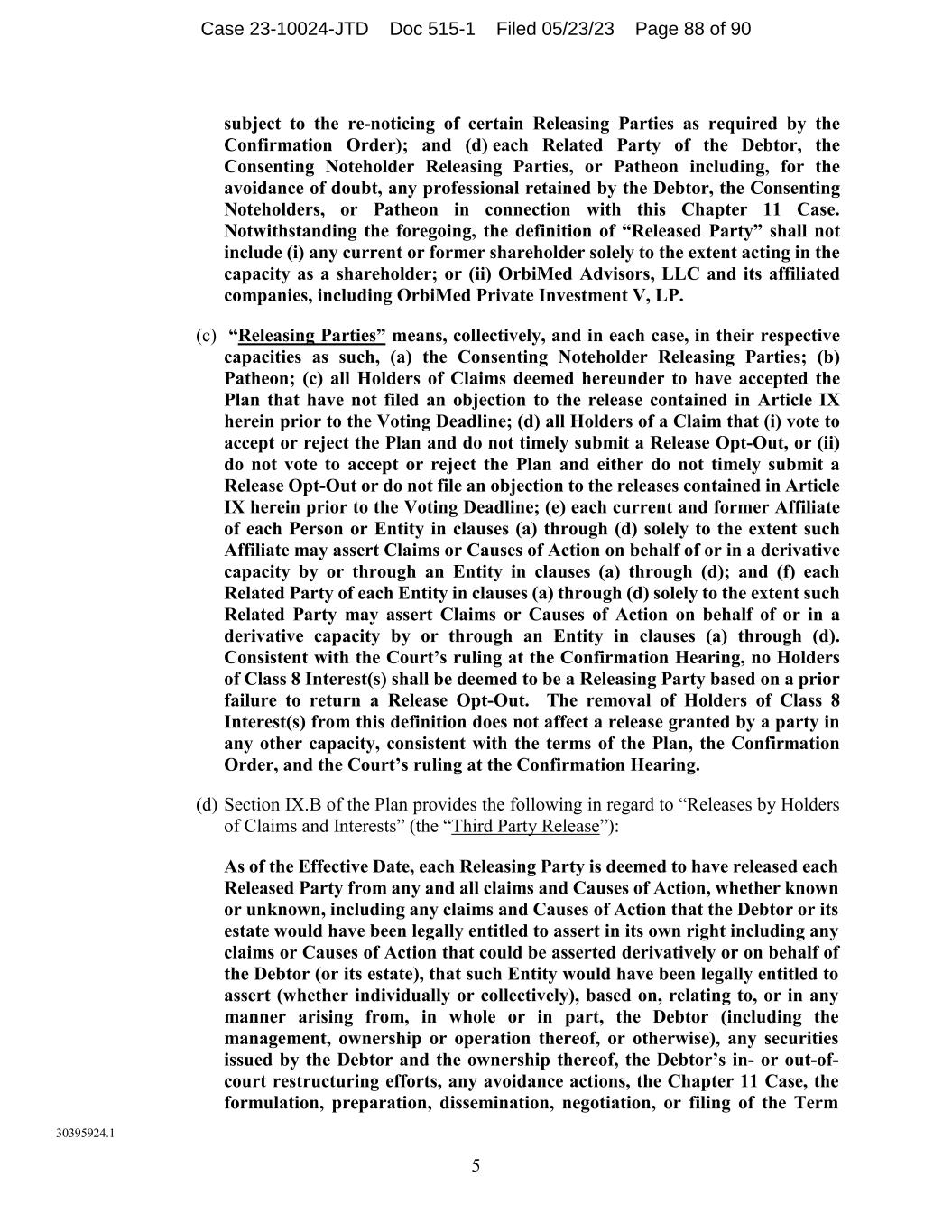 530395924.1但须按照确认令的要求重新通知某些解除担保方);(d)债务人的每一关联方、同意票据持有人解除担保方或Patheon,包括为免生疑问而由债务人、同意票据持有人或Patheon聘用的与第11章案件有关的任何专业人员。尽管有上述规定,“被解放方”的定义不应包括(i)任何仅以股东身份行事的现任或前任股东;或(ii)OrbiMed Advisors,LLC及其附属公司,包括OrbiMed Private Investment V,LP。(c)“解除担保方”是指(a)持同意意见的票据持有人解除担保方;(b)Patheon;(c)在表决截止日期前未对本文第九条所载的解除担保权提出异议的根据本协议被视为已接受本计划的所有债权持有人;(d)所有债权持有人(i)投票接受或否决本计划,但未及时提交解除担保权选择,或(ii)不投票接受或否决该计划,或不及时提交解除选择退出,或不在投票截止日期前对本文第九条所载的解除提出反对;(e)(a)至(d)条中每个人或实体的每个现任和前任附属机构,仅限于该附属机构可以代表或通过(a)至(d)条中的一个实体以衍生身份或通过该实体主张索赔或诉讼理由;(f)(a)至(d)条中的每一实体的每一关联方,仅限于该关联方可以代表或通过(a)至(d)条中的某一实体以衍生身份提出索赔或诉讼理由。根据法院在确认聆讯中的裁决,第8类权益的任何持有人均不得因先前未能退回选择退出的解除协议而被视为解除协议的一方。将第8类权益持有人从这一定义中除名并不影响一方以任何其他身份根据计划、确认令和法院在确认聆讯中的裁决所给予的释放。(d)该计划第IX.B节就“债权和权益持有人的解除”(“第三方解除”)规定如下:自生效之日起,每一解除方被视为已解除每一解除方的任何和所有已知或未知的债权和诉讼因由,包括债务人或其遗产在法律上本有权自行主张的任何债权和诉讼因由,包括可衍生或代表债务人(或其遗产)主张的任何债权或诉讼因由,该实体在法律上本应有权(无论是单独或集体地)根据债务人的全部或部分(包括其管理、所有权或经营或其他方式)主张债务人发行的任何证券及其所有权、债务人在法庭内外的重组努力、任何撤销诉讼、第11章案件、术语案件的拟订、编制、传播、谈判或备案23-10024-JTD Doc 515-1提交05/23/23第88页,共90页