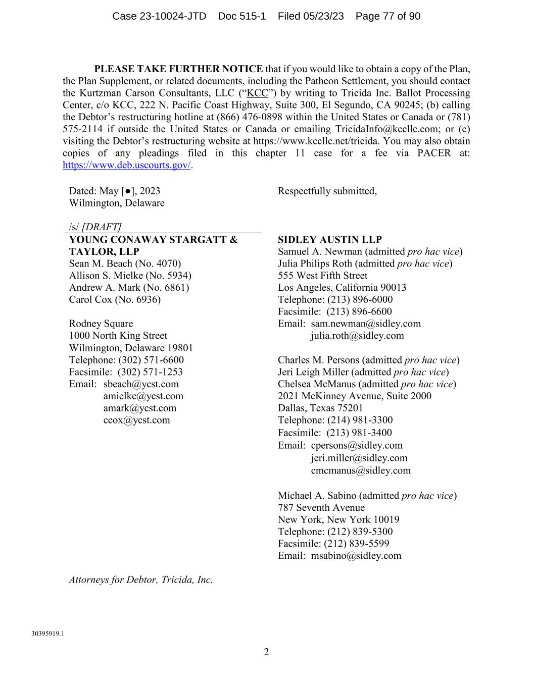230395924.1请进一步注意,如果您希望获得计划、计划补充或包括Patheon和解在内的相关文件的副本,您应该联系Kurtzman Carson Consultants,LLC(“KCC”),写信给Tricida公司选票处理中心,地址是KCC,222 N. Pacific Coast Highway,Suite 300,El Segundo,加利福尼亚州 90245;(b)在美国或加拿大境内拨打债务人重组热线(866)476-0898,在美国或加拿大境外拨打(781)575-2114,或发送电子邮件至TricidaInfo@kccllc.com;或(c)访问债务人重组网站:https://www.kccllc.c你也可以通过PACER索取在第11章案件中提交的任何诉状的副本,收费:https://www.deb.uscourts.gov/。日期:2023年5月[ ● ]尊敬地提交,Wilmington,Delaware/s/[ DRAFT ] YOUNG CONAWAY STARGATT & TAYLOR,LLP SIDLEY AUSTIN LLP Samuel A. Newman(pro hac vice承认)Sean M. Beach(No. 4070)Allison S. Mielke(No. 5934)Andrew A. Mark(No. 6861)Carol Cox(No. 6936)Rodney Square Julia Philips Roth(pro hac vice承认)555 West Fifth Street Los Angeles,California 90013电话:(213)896-6000传真:(213)896-6600电子邮件:sam.newman@sidley.com 1000 North King Street julia.roth @ sidle特拉华州19801电话:(302)571-6600 Charles M. Persons(admitted pro hac vice)传真:(302)571-1253 Jeri Leigh Miller(admitted pro hac vice)电子邮件:sbeach@ycst.com Chelsea McManus(admitted pro hac vice)amielke@ycst.com 2021 McKinney Avenue,Suite 2000 amark@ycst.com Dallas,Texas 75201 ccox@ycst.com电话:(214)981-3300传真:(213)981-3400电子邮件:cpersons@sidley.com jeri.miller@sidley.com cmcmanus@sidley.com Michael A. Sabino(admitted pro hac v