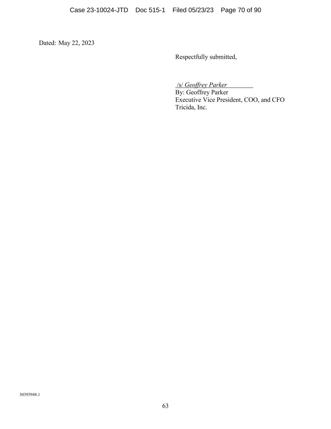 6330395948.1日期:2023年5月22日尊敬地提交,/s/Geoffrey Parker作者:Geoffrey Parker执行副总裁、首席运营官兼首席财务官Tricida, Inc.案例23-10024-JTD文档515-1提交05/23/23第70页,共90页