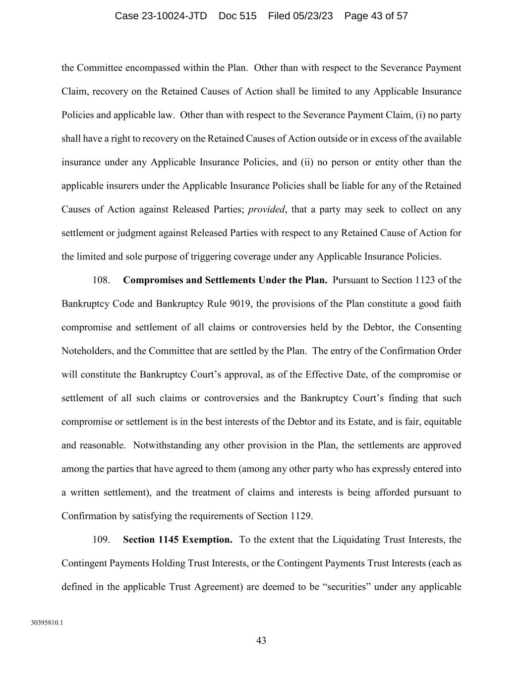 43303958 10.1该计划涵盖了委员会。除遣散费索偿外,对保留诉讼因由的追讨应限于任何适用的保险单和适用的法律。除遣散费索偿外,(i)任何一方均无权在任何适用保险单下的可用保险之外或超出任何适用保险单下的可用保险的范围内,就保留的诉讼因由要求赔偿;(ii)除适用保险单下的适用保险人外,任何人或实体均不得对任何保留的针对被解除当事人的诉讼因由承担赔偿责任,但前提是,一方当事人可寻求就任何保留的诉讼因由对被释放当事人作出的任何和解或判决收取费用,其目的仅限于触发任何适用保险单的承保范围。108.计划下的妥协和解决办法。根据《破产法》第1123条和《破产规则》第9019条,该计划的规定是对债务人、同意票据持有人和委员会提出的所有由该计划解决的索赔或争议的善意妥协和解决。确认令的加入将构成破产法院自生效之日起批准所有此类索赔或争议的妥协或解决,以及破产法院裁定此类妥协或解决符合债务人及其遗产的最佳利益,并且是公平、公平和合理的。尽管《计划》中有任何其他规定,但和解是在已同意和解的各方(在已明确订立书面和解的任何其他方之间)之间批准的,根据《确认书》,通过满足第1129条的要求来处理索赔和利益。109.第1145条豁免。在清算信托权益、持有信托权益的或有付款或或有付款信托权益(在适用的信托协议中定义)被视为任何适用案例23-10024-JTD Doc 515下的“证券”的情况下提交05/23/23第43页,共57页