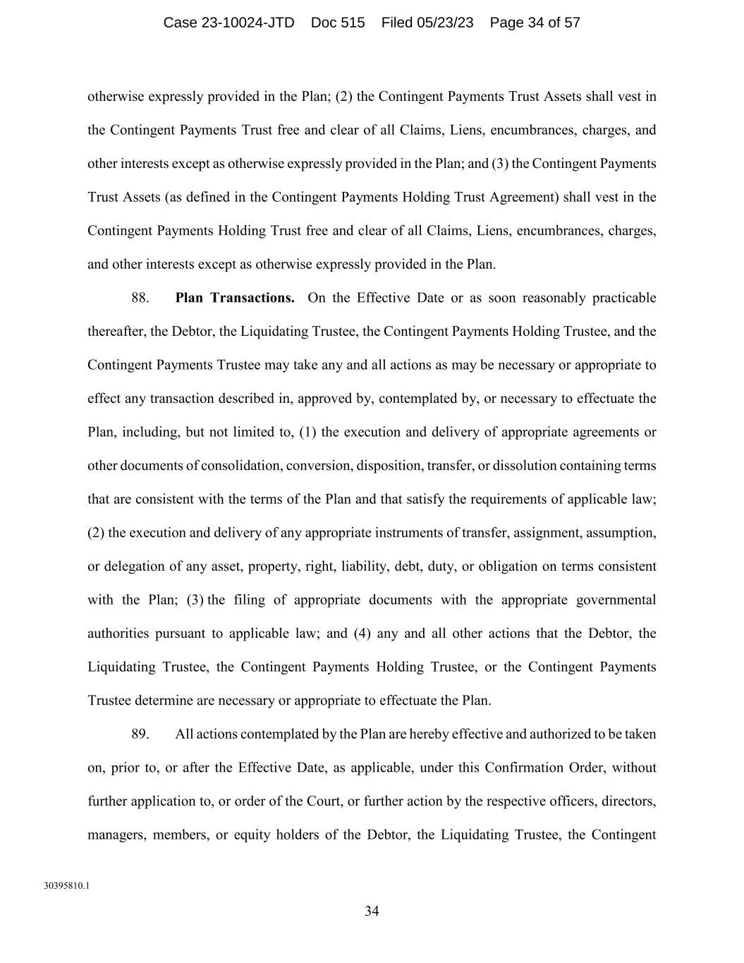 34303958 10.1本计划另有明文规定;(2)或有付款信托资产应归属于或有付款信托,除本计划另有明文规定外,不附带任何债权、留置权、产权负担、费用和其他权益;(3)或有付款信托资产(定义见《或有付款持有信托协议》)应归属于或有付款持有信托,不附带任何债权、留置权、产权负担、费用和其他权益,除非《或有付款持有信托协议》另有明文规定。88.计划交易。在生效日期当日或其后合理切实可行的范围内,债务人、清算受托人、或有付款受托人及或有付款受托人可采取任何或一切必要或适当的行动,以进行计划内所述、计划内所批准、计划内所设想或为实施计划所必需的任何交易,包括但不限于(1)有关合并、转换、处分、转让的适当协议或其他文件的签立及交付,(2)按照与本计划一致的条款,执行和交付任何资产、财产、权利、责任、债务、义务或义务的转让、转让、承担或委托的适当文书;(3)根据适用法律向有关政府当局提交适当的文件;(4)债务人、清算受托人、或有付款持有受托人或或有付款受托人认为为执行本计划而必要或适当的任何和所有其他行动。89.本计划所设想的所有行动,在此生效,并授权在适用的生效日期之前或之后根据本确认令采取,而无须再向法院提出申请或作出命令,亦无须债务人、清盘受托人、或有个案23-10024-JTD Doc 515提交05/23/23第34页,共57页