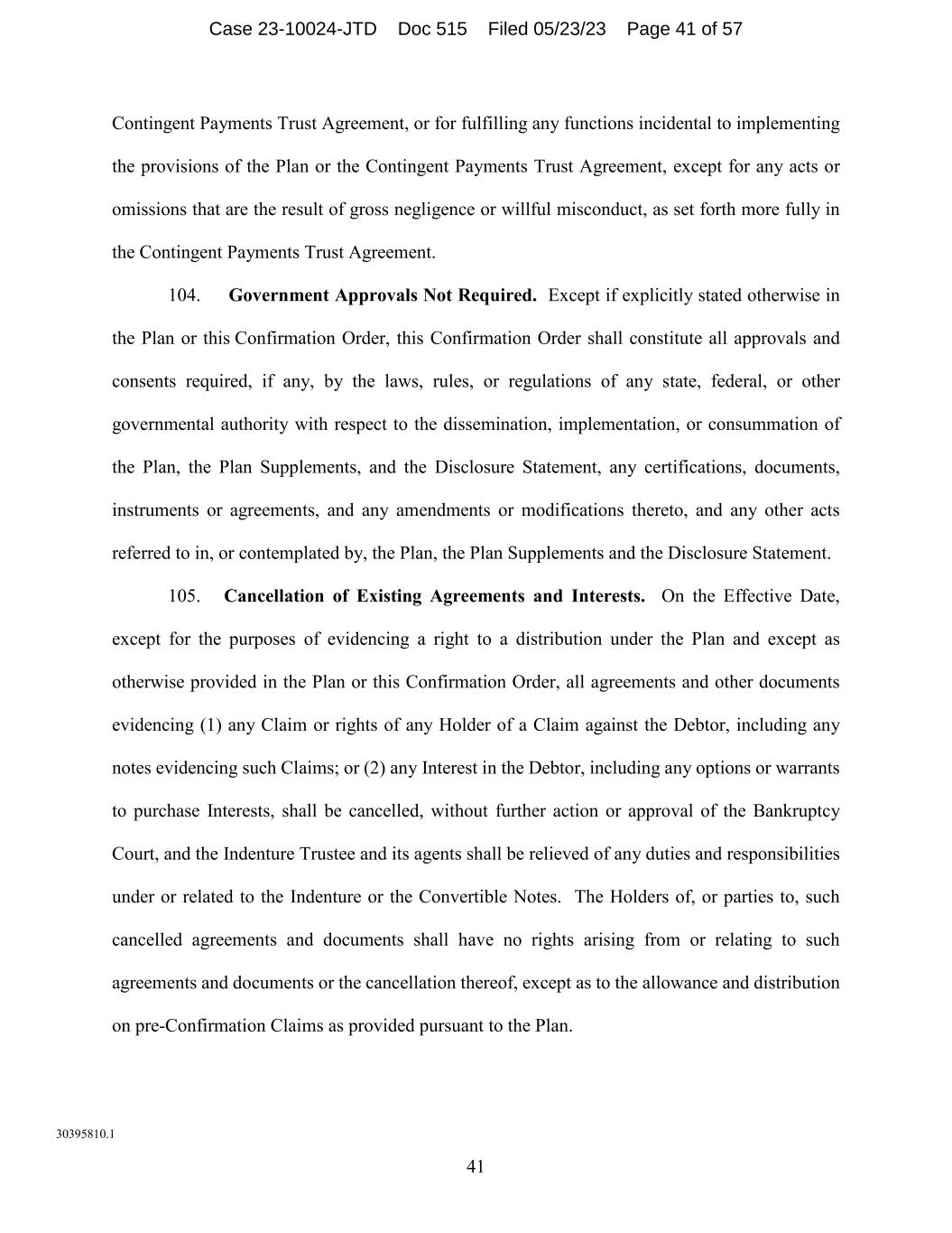 4130395810.1或有付款信托协议,或履行与执行本计划或或或有付款信托协议的规定有关的任何附带职能,但因重大过失或故意不当行为而产生的任何作为或不作为除外,如《或有付款信托协议》中更详细规定的那样。104.不需要政府批准。除非本计划或本确认令另有明文规定,本确认令应构成任何州、联邦或其他政府当局的法律、规则或条例所要求的所有批准和同意(如有),以传播、实施或完成本计划、计划补充、披露声明、任何证明、文件、文书或协议,以及对其的任何修订或修改,以及本计划、计划补充和披露声明中提及或设想的任何其他行为。105.现有协议和权益的取消。自生效日期起,除为证明根据本计划享有分配权的目的外,并除本计划或本确认令另有规定外,证明(1)任何债权持有人对债务人的任何债权或权利的所有协议及其他文件,包括证明该债权的任何票据;或(2)债务人的任何权益,包括购买权益的任何选择权或认股权证,均应予取消,而无须破产法院采取进一步行动或批准,义齿受托人及其代理人应被免除在义齿或可转换票据项下或与之相关的任何义务和责任。这些被取消的协议和文件的持有人或当事人不享有因这些协议和文件或取消这些协议和文件而产生或与之有关的任何权利,但根据本计划规定的确认前索偿的津贴和分配除外。判例23-10024-JTD Doc 515提交05/23/23第41页
