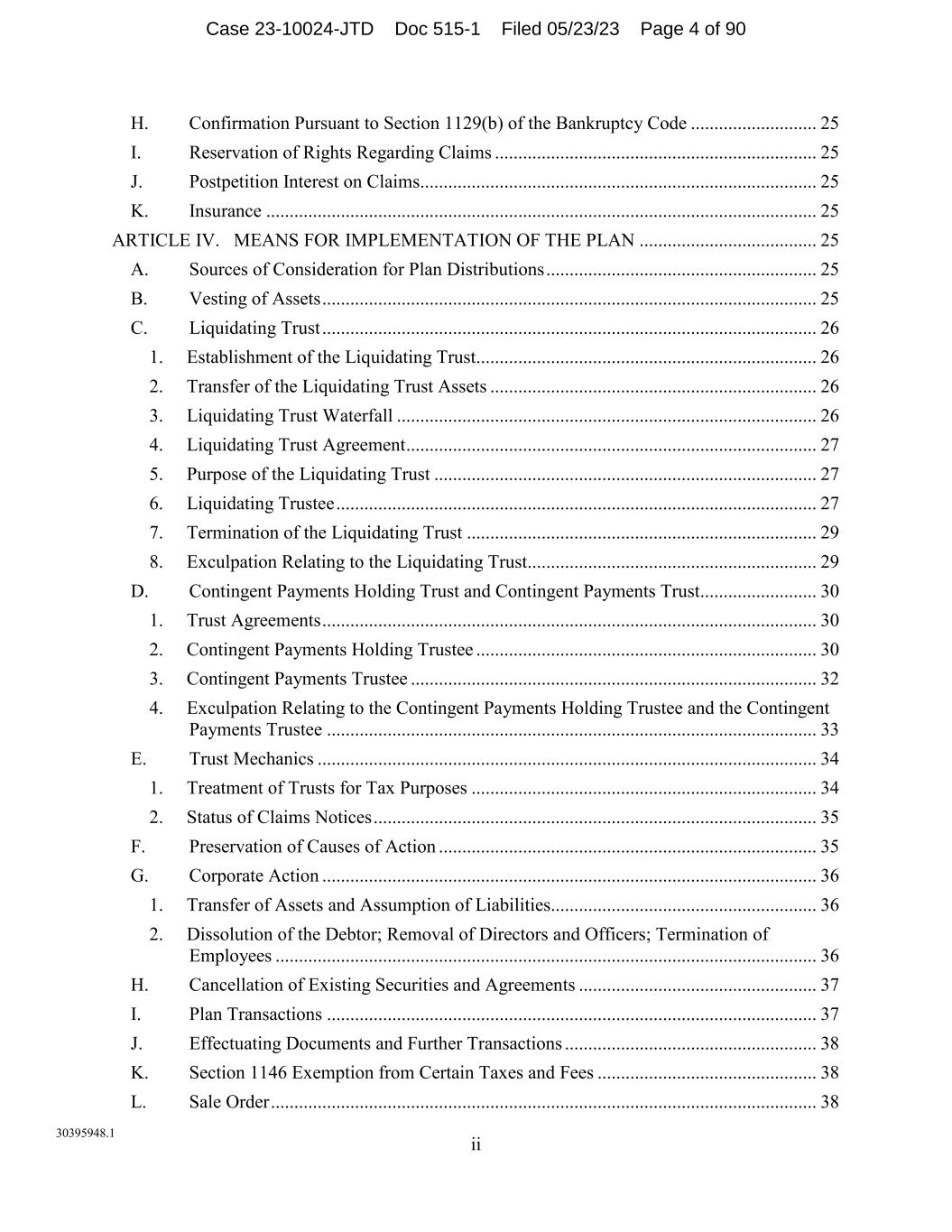 ii 30395948.1 H.根据《破产法》第1129(b)条作出的确认.................................25一.对债权的权利保留.................................................................25 J.债权的延期利息.................................................................................25 K.保险.................................................................................................................25第四条。计划的执行方式......................................................25 A.计划分配的对价来源......................................................................25 B.资产的归属......................................................................................25 C.清算信托......................................................................................................26 1。清算信托的设立.....................................................................................26 2。清算信托资产的转让......................................................................................263。清算信托瀑布....................................................................................................26 4。清算信托协议......................................................................................................275。清算信托的目的..................................................................................................276。清盘受托人...................................................................................................................27 7。清盘信托的终止...................................................................................29 8。与清算信托有关的免责说明....................................................................29 D.或有付款持有信托和或有付款信托.................................30 1。信托协议.....................................................................................................30 2。或有付款持有受托人.................................................................................30 3。或有付款受托人...................................................................................................32 4。与持有或有付款的受托人和或有付款的受托人有关的免责说明.....................................................................................................33 E.信任机制.............................................................................................................34 1。税务信托的处理....................................................................................34 2。索赔通知的现状.......................................................................................................35 F.诉讼理由的保留.......................................................................35 G.公司诉讼.......................................................................................................36 1。资产的转移和负债的承担.................................................................36 2。债务人的解散;董事和高级职员的免职;雇员的解雇.....................................................................................................36 H.现有证券和协议的取消.................................................................................................37 J.生效文件和进一步的交易.....................................................................38 K.第1146条免除某些税费.....................................38 L.出售令.....................................................................................................38案例23-10024-JTD Doc 515-1提交05/23/23第4页,共90页
