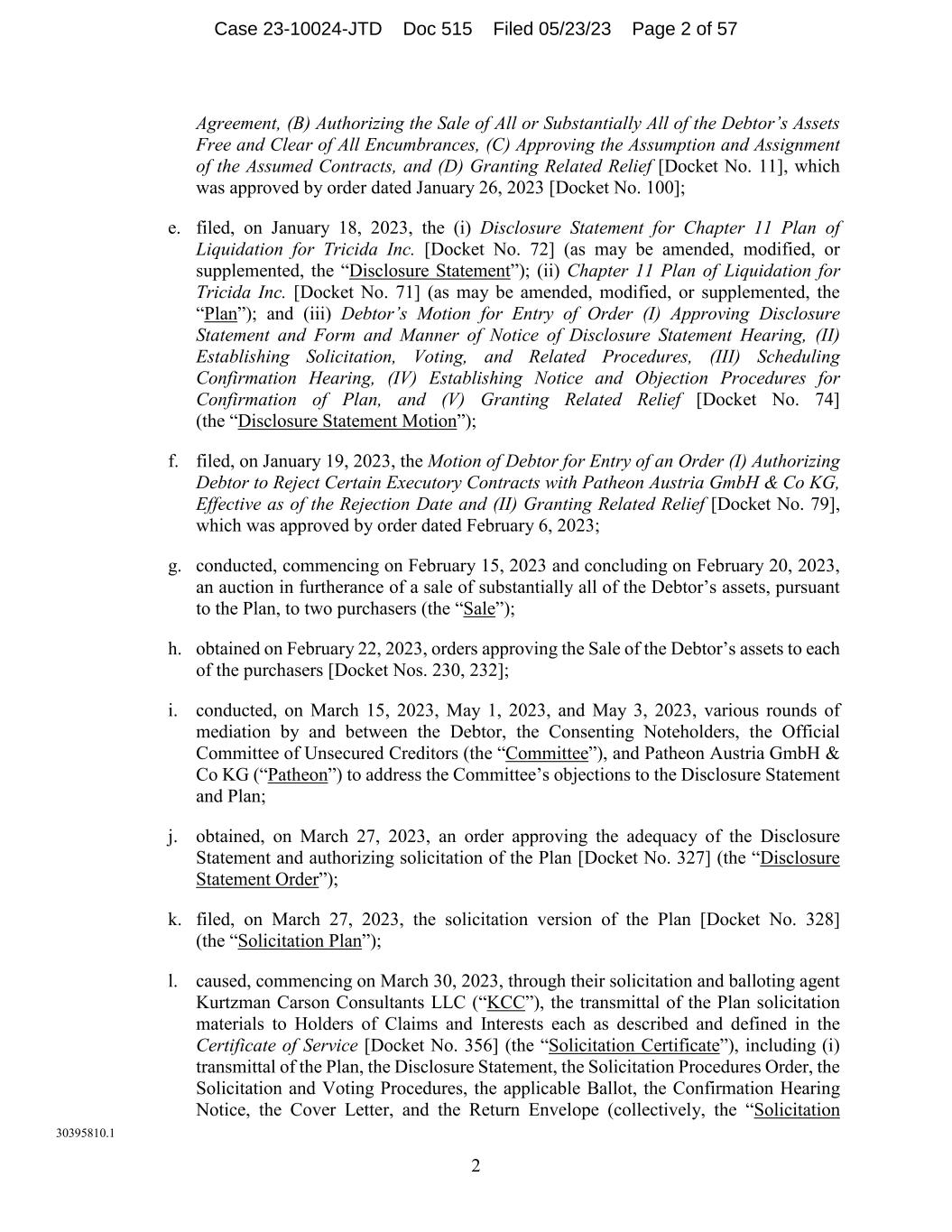 2303958 10.1协议,(B)授权出售债务人的全部或几乎全部资产,不附带任何产权负担,(C)批准假定合同的承担和转让,(D)给予相关救济[案卷第11号],2023年1月26日[案卷第100号]命令批准;e.于2023年1月18日提交(i)Tricida公司第11章清算计划的披露声明[案卷第72号](可修订、修改或补充,(二)《Tricida公司第11章清算计划》[案卷第71号](可对《计划》进行修订、修改或补充);(三)《债务人请求下达命令的动议》(一)《批准披露声明》和《披露声明听证会通知的形式和方式》,(二)建立征集、投票和相关程序,(三)安排确认听证会,(四)建立确认计划的通知和异议程序,以及(五)授予相关救济[案卷第74号](“披露声明动议”);f.于2023年1月19日提交,债务人请求下达命令的动议(I)授权债务人拒绝与Patheon Austria GmbH & Co KG签订的某些执行合同,自拒绝日期起生效,以及(II)授予相关救济[案卷第79号],该动议已于2023年2月6日通过命令批准;g.自2023年2月15日起至2023年2月20日结束,进行拍卖,以推进根据该计划向两个买方出售债务人的几乎所有资产(“出售”);h.于2023年2月22日获得,批准将债务人资产出售给每一收购方的命令[案卷第230、232号];i.于2023年3月15日、2023年5月1日和2023年5月3日,由债务人、同意票据持有人、无担保债权人官方委员会(“委员会”)和Patheon Austria GmbH & Co KG(“Patheon”)进行了多轮调解,以解决委员会对披露声明和计划的反对意见;j.于2023年3月27日获得了一项命令,批准披露声明的充分性并授权征求计划[案卷第327号](“披露声明令”);k.提交,2023年3月27日,计划[第328号案卷](“征集计划”)的征集版本;l.于2023年3月30日开始,通过其征集和投票代理Kurtzman Carson Consultants LLC(“KCC”),向服务证书[第356号案卷](“征集证书”)中描述和定义的债权和权益持有人发送计划征集材料,包括(i)发送计划、披露声明、征集程序令、征集和投票程序、适用的投票、确认听证通知、求职信和回函(统称,"征集案件23-10024-JTD Doc 515提交05/23/23第2页,共57页