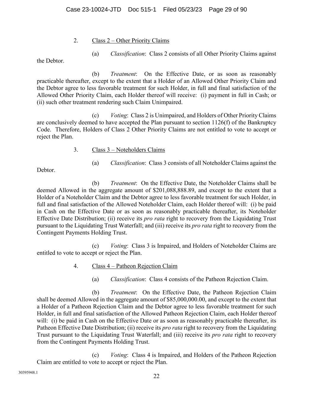 22 30395948.1 2.第2类–其他优先权债权(a)分类:第2类包括针对债务人的所有其他优先权债权。(b)处理:自生效之日起,或在其后合理可行的范围内尽快,除非允许的其他优先权要求的持有人和债务人同意对该持有人给予较不利的待遇,以完全和最终清偿允许的其他优先权要求,否则每一持有人将收到:(一)以现金全额支付;或(二)使此种要求不受损害的其他处理。(c)表决:第2类未受损害,而其他优先债权的持有人根据《破产法》第1126(f)条被最终视为已接受该计划。因此,第2类其他优先债权的持有人无权投票接受或否决该计划。3.第3类–票据持有人债权(a)分类:第3类包括所有票据持有人对债务人的债权。(b)处理办法:在生效日期,记名持有人债权应被视为获准,总额为201,088,888.89美元,除非记名持有人债权的持有人和债务人同意给予该持有人较低的优惠待遇,以完全和最终清偿获准记名持有人债权,否则,每一持有人将:(i)在生效日期或其后在合理可行的范围内尽快以现金支付,其票据持有人生效日期分配;(ii)根据清算信托瀑布获得其按比例从清算信托收回的权利;(iii)获得其按比例从或有付款持有信托收回的权利。(c)投票:第3类受损,票据持有人债权持有人有权投票接受或否决该计划。4.第4类– Patheon拒绝请求(a)分类:第4类由Patheon拒绝请求组成。(b)处理:在生效日期,Patheon驳回索赔应被视为被允许的总额为85,000,000.00美元,除非Patheon驳回索赔的持有人和债务人同意对该持有人给予较不利的待遇,以完全和最终满足被允许的Patheon驳回索赔,否则每一持有人将:(i)在生效日期或在合理可行的情况下尽快以现金支付,其Patheon生效日期分配;(ii)根据清算信托瀑布获得其按比例从清算信托收回的权利;(iii)获得其按比例从或有付款持有信托收回的权利。(c)投票:第4类受损,Patheon拒绝索赔持有人有权投票接受或否决该计划。判例23-10024-JTD Doc 515-1提交05/23/23第29页,共90页