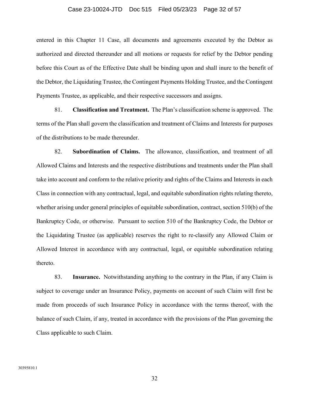 32303958 10.1在本第11章案件中,债务人根据其授权和指示签署的所有文件和协议,以及自生效之日起在本法院待决的债务人关于救济的所有动议或请求,均对债务人、清算受托人、或有付款受托人、或有付款受托人(如适用)及其各自的继承人和受让人具有约束力,并对其有利。81.分类和治疗。该计划的分类方案获得批准。本计划的条款应适用于债权和权益的分类和处理,以便根据本计划进行分配。82.索偿的从属地位。所有允许的债权和权益的允许、分类和处理,以及计划下的相应分配和处理,应考虑并符合每一类债权和权益在与之相关的任何合同、法律和衡平法上的从属权利方面的相对优先权和权利,无论是根据衡平法从属的一般原则、合同、《破产法》第510(b)条或其他方面产生的权利。根据《破产法》第510条,债务人或清算受托人(如适用)保留根据与此有关的任何合同、法律或衡平法排序,将任何允许的债权或允许的权益重新分类的权利。83.保险。尽管本计划另有相反规定,但如任何索偿须在保险单的承保范围内,就该索偿而作出的付款,须先按照该保险单的条款,从该保险单的收益中支付,而如有任何索偿的余额,则须按照适用于该等索偿的类别的计划的条文处理。判例23-10024-JTD Doc 515提交05/23/23第32页,共57页
