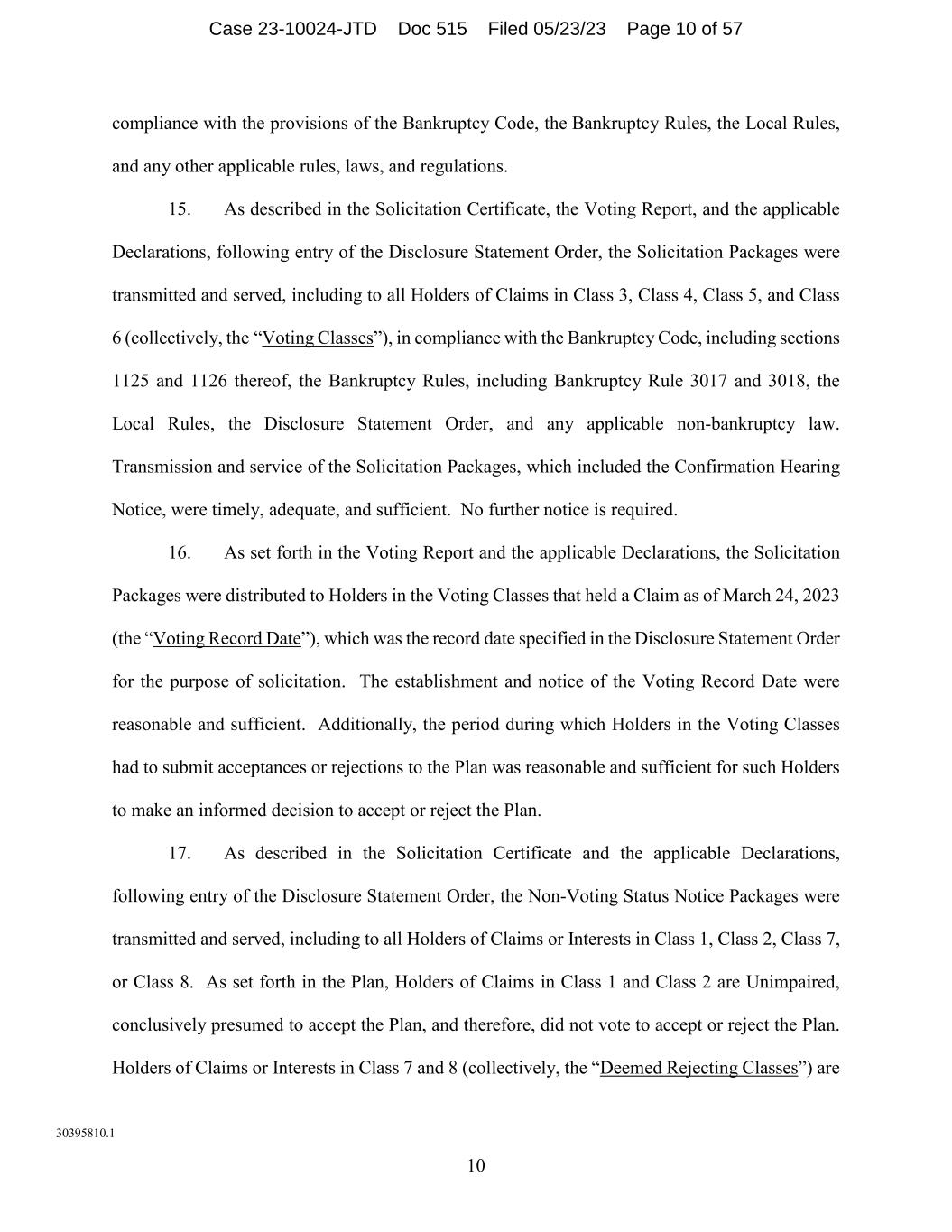 10303958 10.1遵守《破产法》、《破产规则》、《地方规则》和任何其他适用的规则、法律和条例的规定。15.正如《征集证书》、《投票报告》和适用的声明中所述,在披露声明令生效后,征集包按照《破产法》(包括第1125和1126条)、《破产规则》(包括《破产规则》第3017和3018条)、《地方规则》、《披露声明令》和任何适用的非破产法,被传送和送达,包括第3类、第4类、第5类和第6类的所有债权持有人(统称“投票类别”)。包括确认听证通知在内的招标包的传送和服务是及时、充分和充分的。无需另行通知。16.正如投票报告和适用的声明中所述,截至2023年3月24日(“投票记录日期”),即披露声明令中为招标目的规定的记录日期,向持有索赔的投票类别的持有人分发了招标包。投票记录日期的设立和通知是合理和充分的。此外,投票类别的持有人必须对计划提出接受或拒绝的期限是合理和充分的,使这些持有人能够在知情的情况下决定接受或拒绝计划。17.正如征求证书和适用的声明中所述,在披露声明令生效后,非投票状态通知包被传送和送达,包括第1类、第2类、第7类或第8类的所有债权或权益持有人。正如该计划所述,第1类和第2类债权的持有人未受损害,最终推定接受该计划,因此没有投票接受或否决该计划。第7类及第8类(统称为“视为拒绝类别”)的申索或权益持有人为判例23-10024-JTD Doc 515提交05/23/23第10页,共57页