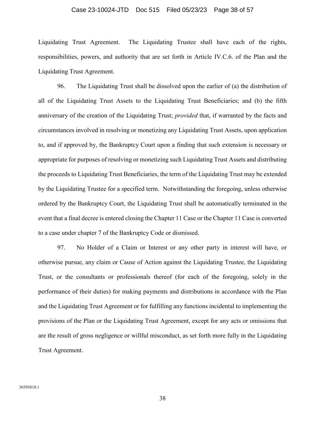 3830395810.1清算信托协议。清算受托人应享有本计划第IV.C.6条和《清算信托协议》规定的各项权利、责任、权力和授权。96.清算信托应于(a)将清算信托资产全部分配给清算信托受益人;及(b)清算信托成立五周年时(以较早者为准)解散;但如因清算信托资产或将其货币化所涉及的事实和情况所证明,经向破产法院提出申请,并经破产法院裁定,为解决清算信托资产或将其货币化,并将收益分配给清算信托受益人,此种延期是必要或适当的,清算信托的期限可由清算受托人延长一段规定的期限。尽管有上述规定,除非破产法院另有命令,否则,如果对第11章案件作出终结判决,或第11章案件根据《破产法》第7章被转换为案件或被驳回,清算信托应自动终止。97.任何债权或权益的持有人或任何其他利益方均不会因根据计划和清算信托协议支付和分配款项或履行执行计划或清算信托协议的规定所附带的任何职能而向清算受托人、清算信托或其顾问或专业人员提出或以其他方式提出任何债权或诉讼因由,但因重大过失或故意不当行为而导致的任何作为或不作为除外,正如清算信托协议中更全面地阐述的那样。判例23-10024-JTD Doc 515提交05/23/23第38页,共57页