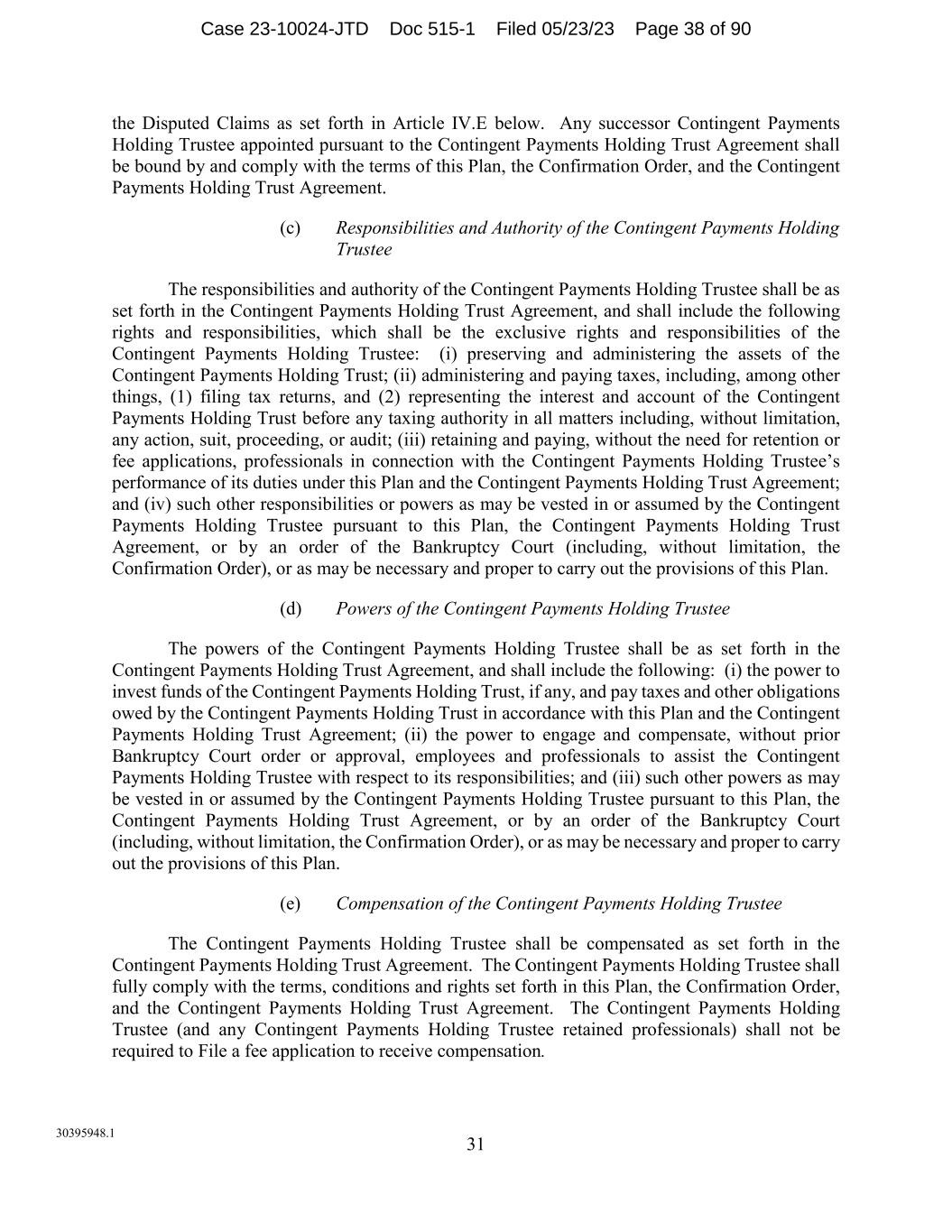 3130395948.1下文第IV.E条所述有争议的权利要求。根据或有付款持有信托协议指定的任何后续或有付款持有受托人应受本计划、确认令和或有付款持有信托协议条款的约束和遵守。(c)或有付款持有受托人的责任和权限或有付款持有受托人的责任和权限应在《或有付款持有信托协议》中规定,并应包括下列权利和责任,这些权利和责任是或有付款持有受托人的专属权利和责任:(一)保护和管理或有付款持有信托的资产;(二)管理和支付税款,其中包括(1)提交纳税申报表,(2)在所有事宜上,包括但不限于任何诉讼、诉讼、法律程序或审计,在任何税务当局面前代表或有付款持有信托的权益及帐目;(iii)在或有付款持有受托人履行其在本计划及或有付款持有信托协议下的职责时,保留并支付专业人员,而无须保留或收取费用;及(iv)或有付款持有受托人根据本计划、或有付款持有信托协议可能赋予或承担的其他责任或权力,或藉破产法庭的命令(包括但不限于确认令),或为执行本计划的条文而有需要及适当的。(d)或有付款持有受托人的权力或有付款持有受托人的权力应按《或有付款持有信托协议》的规定,并应包括以下内容:(i)根据本计划和《或有付款持有信托协议》,投资或有付款持有信托基金的资金,以及支付或有付款持有信托基金所欠税款和其他债务的权力;(ii)未经破产法院事先命令或批准,有权参与或补偿,雇员和专业人员协助或有付款持有受托人履行其职责;及(iii)或有付款持有受托人根据本计划、或有付款持有信托协议或破产法院命令(包括但不限于确认令)赋予或承担的其他权力,或为执行本计划的规定而可能需要和适当的其他权力。(e)对持有受托人的或有付款的补偿持有受托人的或有付款应按《或有付款持有信托协议》的规定予以补偿。或有付款持有受托人应完全遵守本计划、确认令和或有付款持有信托协议中规定的条款、条件和权利。持有或有付款的受托人(以及任何持有或有付款的受托人聘用的专业人员)无需提交费用申请以获得补偿。判例23-10024-JTD Doc 515-1提交05/23/23第38页,共90页