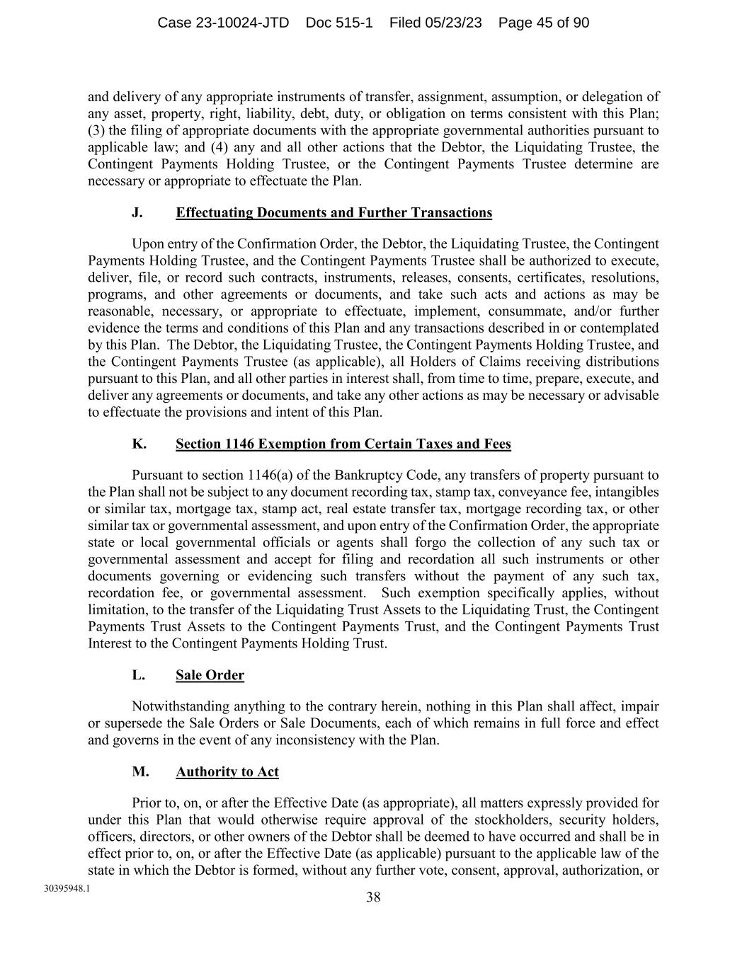 3830395948.1并按照与本计划相符的条件交付任何资产、财产、权利、责任、债务、义务或义务的转让、转让、承担或转手的任何适当文书;(3)根据适用法律向有关政府当局提交适当的文件;(4)债务人、清算受托人、或有付款受托人或或有付款受托人认为为实施本计划而必要或适当的任何和所有其他行动。J.生效文件和进一步的交易确认令生效后,债务人、清算受托人、或有付款受托人和或有付款受托人应被授权执行、交付、归档或记录此类合同、文书、解除、同意书、证书、决议、程序和其他协议或文件,并采取合理、必要或适当的行动和行动,以实施、实施、完成和/或进一步证明本计划的条款和条件以及本计划中描述或设想的任何交易。债务人、清算受托人、或有付款受托人、或有付款受托人(如适用)、根据本计划接受分配的所有债权持有人及所有其他利益方应不时准备、执行和交付任何协议或文件,并采取任何必要或可取的其他行动,以实现本计划的规定和意图。K.第1146条根据《破产法》第1146(a)条豁免某些税项及费用,根据该计划进行的任何财产转让,均无须缴付任何单据,以记录税项、印花税、转易费、无形资产或类似税项、按揭税、印花税法、不动产转让税、按揭税或其他类似税项或政府评估,而在确认令生效后,适当的州或地方政府官员或代理人应放弃征收任何此类税款或政府评估,并接受所有此类文书或其他规范或证明此类转移的文件进行归档和记录,而无需支付任何此类税款、记录费或政府评估。此种豁免具体适用于但不限于将清算信托资产转移至清算信托、将或有付款信托资产转移至或有付款信托以及将或有付款信托利息转移至或有付款持有信托。L.买卖令即使本计划另有相反规定,本计划并不影响、损害或取代买卖令或买卖文件,而每一项命令或买卖文件仍然完全有效,并在与本计划有任何不一致之处时予以规管。M.在生效日期(视情况而定)之前、当日或之后采取行动的权力,本计划明文规定的所有事项,如需债务人的股东、证券持有人、高级管理人员、董事或其他所有人批准,应视为在生效日期(视情况而定)之前、当日或之后发生,并应根据债务人所在国的适用法律在生效日期(视情况而定)之前、当日或之后生效,而无需进一步表决、同意、核准、授权或判例23-10024-JTD Doc 515-1提交05/23/23第45页,共90页