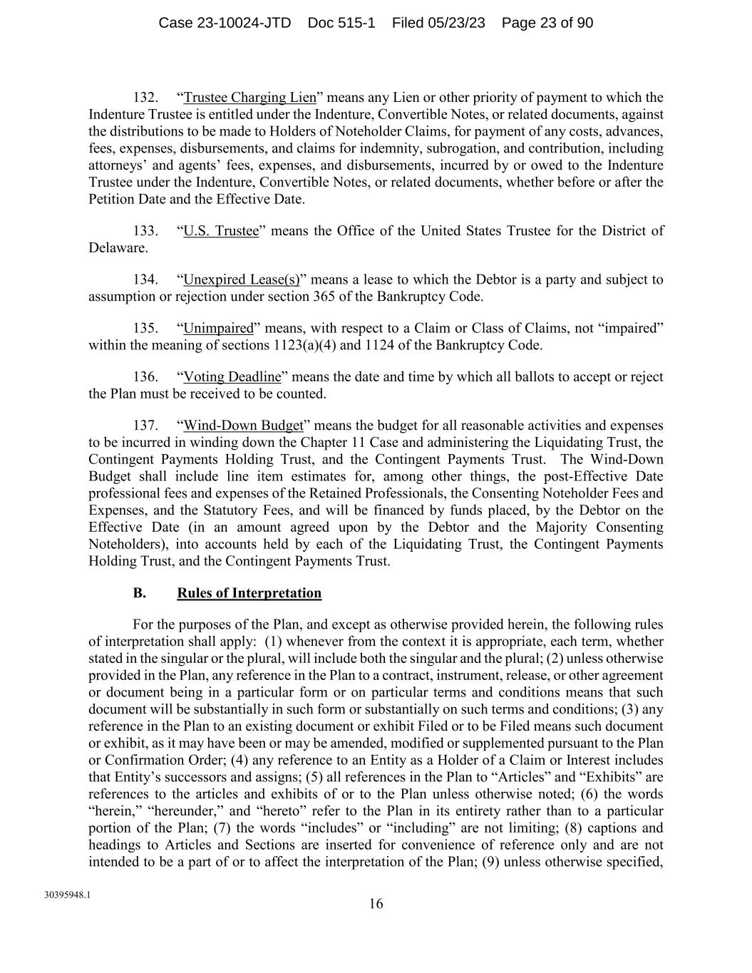 16 30395948.1 132.“受托人收取留置权”是指契约受托人根据契约、可转换票据或相关文件有权获得的任何留置权或其他支付优先权,用于支付契约受托人根据契约、可转换票据或相关文件产生或欠契约受托人的任何费用、垫款、费用、开支、支出以及赔偿、代位和分担的索赔,包括律师和代理人的费用、开支和支出,无论是在申请日期和生效日期之前还是之后。133.“U.S. Trustee”是指美国特拉华地区受托人办公室。134.“未到期的租约”是指债务人作为一方当事人的租约,根据《破产法》第365条,该租约可能会被承担或拒绝。135.就债权或债权类别而言,“未受损”指的是《破产法》第1123(a)(4)和1124条所指的“未受损”。136.“投票截止日期”是指必须收到所有接受或否决该计划的选票才能被计算在内的日期和时间。137.“清盘预算”是指在清盘第11章案件和管理清算信托、或有付款持有信托和或有付款信托时,所有合理活动和开支的预算。清盘预算应包括生效日期后保留专业人员的专业费用和开支、同意记账人费用和开支以及法定费用的细列项目估计数,并将由债务人在生效日期存入清算信托、或有付款持有信托和或有付款信托各自持有的账户的资金(由债务人和多数同意记账人商定的数额)提供资金。解释规则为本计划的目的,除本计划另有规定外,应适用下列解释规则:(1)不论从上下文来看是否适当,每一用语,不论是单数还是复数,均应包括单数和复数;(2)除非本计划另有规定,否则本计划中任何提及合同、文书、解除,(3)本计划内凡提述已提交或将提交的现有文件或展品,即指已提交或将提交的现有文件或展品,而该等文件或展品可能已被修订或可能被修订,根据《计划》或《确认令》修改或补充;(4)凡提及某一实体作为债权或权益的持有人,均包括该实体的继承人和受让人;(5)除非另有说明,否则《计划》中所有提及的“条款”和“展品”均指《计划》的条款和展品或对《计划》的展品;(6)“此处”、“此处”、"和“此处”指的是计划的整体,而不是计划的特定部分;(7)“包括”或“包括”不是限制性的;(8)条款和章节的标题和标题仅为方便参考而插入,并不旨在成为计划的一部分或影响对计划的解释;(9)除非另有说明,案例23-10024-JTD Doc 515-1提交05/23/23第23页,共90页