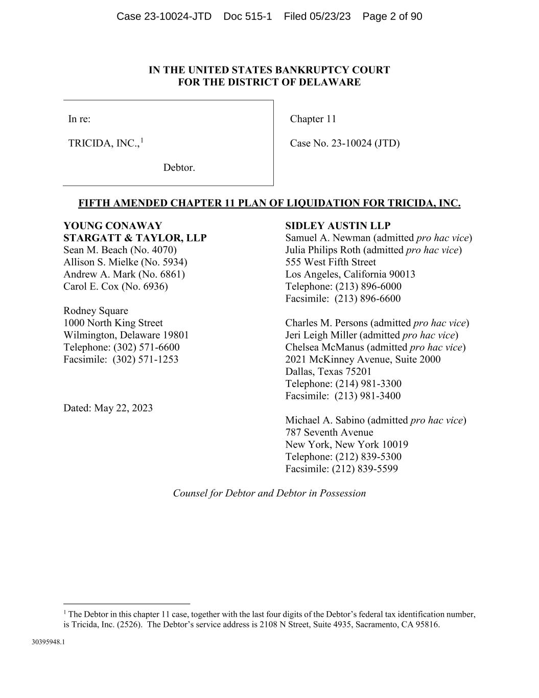 30395948.1 IN THE UNITED STATES BANKRUPTCY COURT FOR THE DISTRICT OF DELAWARE In re:TRICIDA,INC.,1 Debtor。第11章案件编号23-10024(JTD)FIFTH AMENDED CHAPTER 11 PLAN OF LIQUIDATION FOR TRICIDA,INC。YOUNG CONAWAY STARGATT & TAYLOR,LLP Sean M. Beach(No. 4070)Allison S. Mielke(No. 5934)Andrew A. Mark(No. 6861)Carol E. Cox(No. 6936)Rodney Square 1000 North King Street Wilmington,Delaware 19801电话:(302)571-6600传真:(302)571-1253日期:2023年5月22日SIDLEY AUSTIN LLP Samuel A. Newman(admitted pro hac vice)Julia Philips Roth(admitted pro hac vice)555 West Fifth Street Los Angeles,加利福尼亚州90013电话:(213)896-6000传真:(213)896-6600 Charles M. Persons(admitted pro hac vice)Jeri Leigh Miller(admitted pro hac vice)Chelsea McManus(admitted pro hac vice)2021 McKinney Avenue,Suite 2000 Dallas,Texas 75201电话:(214)981-3300传真:(213)981-3400 Michael A. Sabino(admitted pro hac vice)787 Seventh Avenue New York,New York 10019电话:(212)839-5300传真:(212)839-5599债务人和债务人的法律顾问1这11章案件中的债务人,连同债务人联邦税务识别号码的最后四位数字,是Tricida, Inc.(2526)。债务人的服务地址是2108 N Street,Suite 4935,Sacramento,加利福尼亚州 95816。判例23-10024-JTD Doc 515-1提交05/23/23第2页,共90页
