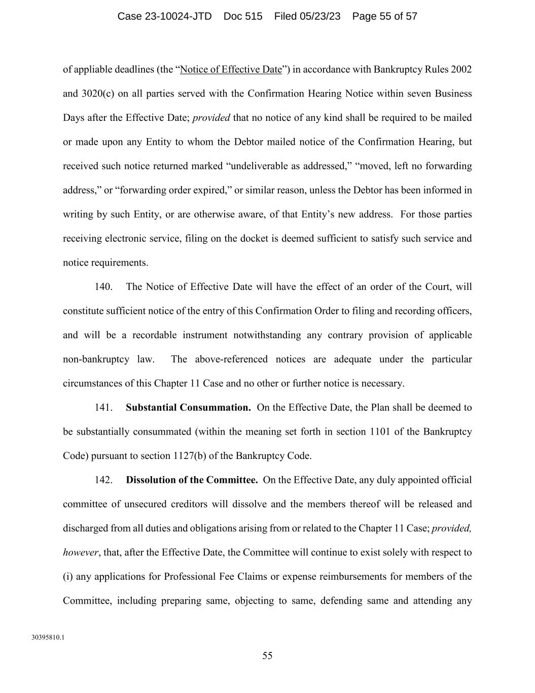 55303958 10.1根据2002年《破产规则》和3020(c)的规定,在确认听证通知生效后七个工作日内送达确认听证通知的所有当事人的适用期限(“生效日期通知”);但债务人向其邮寄确认听证通知,但收到此种通知的实体被标记为“无法按地址送达”、“已移动、未留下转发地址”或“转发令已过期”,则无需向其邮寄或发出任何形式的通知,或类似理由,除非该实体已书面通知债务人或以其他方式知悉该实体的新地址。对于那些接受电子送达的当事人,在案卷上提交的文件被视为足以满足这种送达和通知的要求。140.生效日期通知将具有法院命令的效力,将构成将本确认令记入存档和记录人员的充分通知,并且将是一份可记录的文书,即使适用的非破产法有任何相反的规定。上述通知在本第11章案件的特殊情况下是适当的,不需要其他通知或进一步通知。141.实质性的完成。在生效日期,该计划应被视为根据《破产法》第1127(b)条已基本完成(在《破产法》第1101条所述的含义内)。142.解散委员会。自生效之日起,任何正式指定的无担保债权人正式委员会将解散,其成员将被解除并解除因第11章案件而产生或与之有关的一切职责和义务;但在生效之日后,委员会将继续仅就(i)委员会成员的任何专业费用索偿或费用补偿申请而存在,包括准备申请、反对申请、辩护和出席任何案件23-10024-JTD Doc 515提交05/23/23第55页,共57页