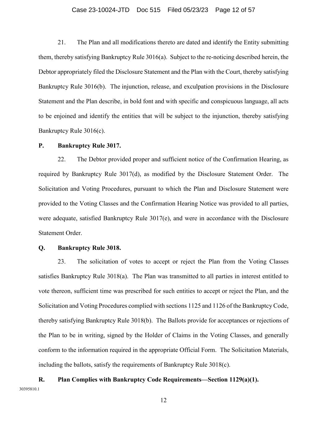 12 30395810.1 21.该计划及其所有修改都注明了日期,并指明了提交这些修改的实体,从而符合破产规则第3016(a)条。在符合本文所述的重新通知的前提下,债务人向法院适当地提交了披露声明和计划,从而符合破产规则第3016(b)条。《披露声明》和《计划》中的禁制令、释放和开脱条款以黑体字和具体、醒目的语言描述了所有被禁止的行为,并指明了将受禁制令约束的实体,从而满足了《破产规则》第3016(c)条的要求。P.破产规则第3017条。22.债务人按照经披露声明令修改的破产规则第3017(d)条的要求,提供了适当和充分的确认听证会通知。征求和表决程序是充分的,符合破产规则第3017(e)条,并符合披露声明令。根据这些程序,计划和披露声明被提供给各投票类别,确认听证通知被提供给所有各方。问:破产规则第3018条。23.从投票类别中征集接受或否决该计划的投票符合破产规则第3018(a)条的规定。该计划已转交有权就该计划进行表决的所有利益相关方,规定这些实体有足够的时间接受或否决该计划,而征求和表决程序符合《破产法》第1125和1126条的规定,从而符合《破产规则》第3018(b)条的规定。投票规定,接受或否决计划须以书面形式提出,并由投票类别中的索偿权人签署,并大致符合适当的正式表格所要求的资料。包括选票在内的征集材料符合《破产规则》第3018(c)条的要求。R.计划符合《破产法》的规定——第1129(a)(1)条。判例23-10024-JTD Doc 515提交05/23/23第12页,共57页