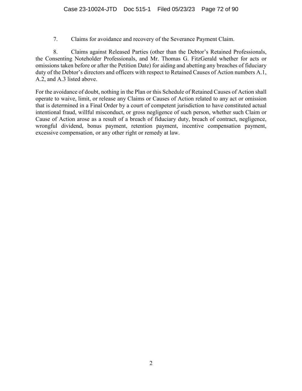 2 7.撤销和追回遣散费索赔的索赔。8.因协助和教唆债务人的董事和高级职员违反上述第A.1、A.2和A.3号《保留诉讼因由》而对被释放的当事人(债务人的留任专业人员、持同意意见的记事人专业人员和Thomas G. FitzGerald先生除外,不论其是否在请愿日期之前或之后采取的作为或不作为)提出的索赔。为免生疑问,本计划或本保留诉讼因由附表中的任何规定,均不得免除、限制或解除与任何作为或不作为有关的任何索偿要求或诉讼因由,而该等作为或不作为是由主管司法管辖权的法院在最终命令中裁定构成该人的实际故意欺诈、故意不当行为或重大过失,不论该等索偿要求或诉讼因由是由于违反信托责任、违反合约、疏忽、不当股息、奖金支付、留存金支付、奖励性补偿支付、过度补偿所致,或法律上的任何其他权利或补救。判例23-10024-JTD Doc 515-1提交05/23/23第72页,共90页