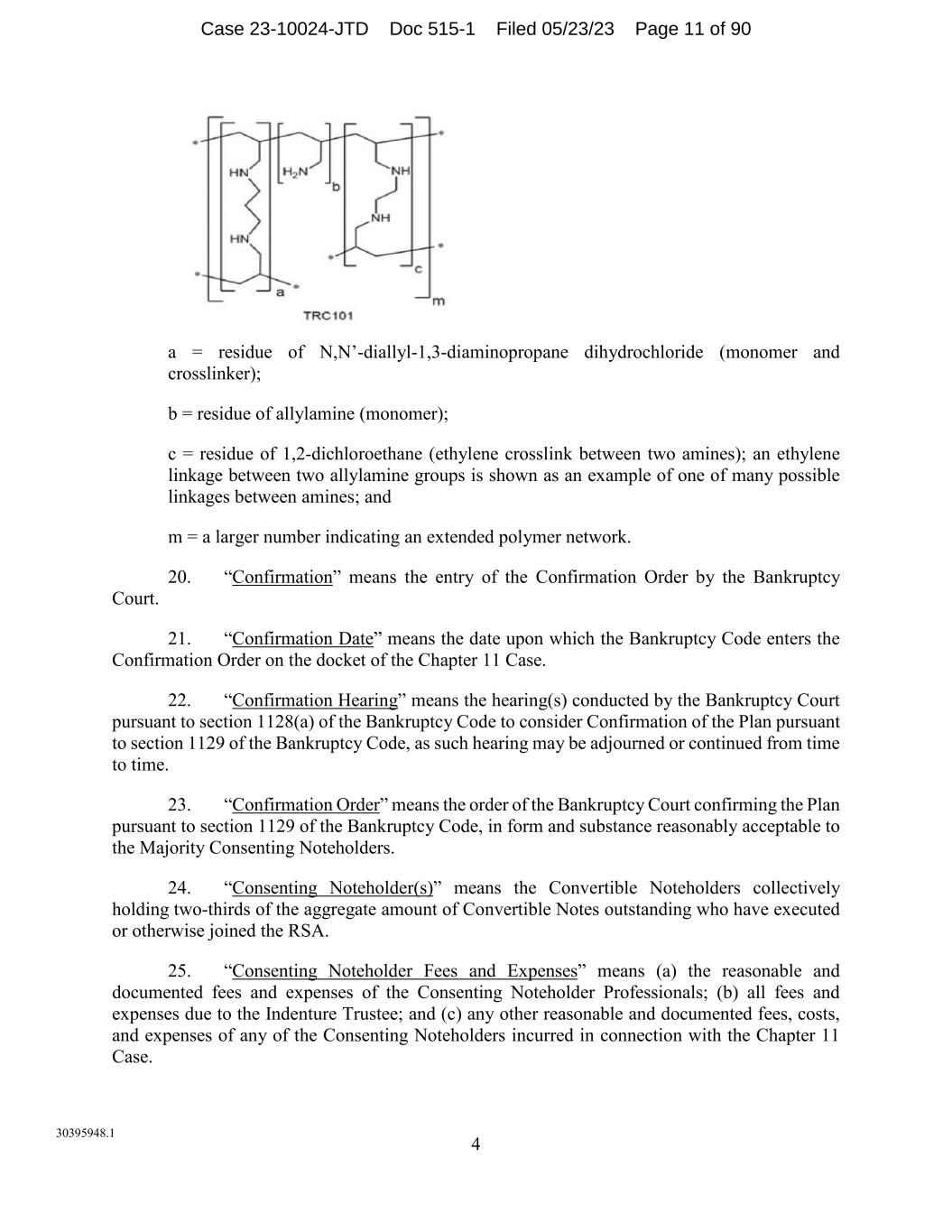 430395948.1 a = N,N’-二烯丙基-1,3-二氨基丙烷二盐酸盐的残留物(单体和交联物);b =烯丙胺的残留物(单体);c = 1,2-二氯乙烷的残留物(两个胺之间的乙烯交联物);两个烯丙胺基团之间的乙烯连接是胺之间许多可能的连接之一的例子;m =一个较大的数字,表示一个扩展的聚合物网络。20.“确认”指的是破产法院发出的确认令。21.“确认日”是指《破产法》将确认令列入第11章案件案卷的日期。22.“确认聆讯”指破产法庭根据《破产法》第1128(a)条进行的聆讯,以考虑根据《破产法》第1129条确认计划,因为该聆讯可能会不时延期或继续。23.“确认令”是指破产法院根据《破产法》第1129条确认该计划的命令,其形式和内容均为多数同意票据持有人合理接受的。24.“同意票据持有人”是指合计持有已执行或以其他方式加入RSA的未偿可转换票据总额三分之二的可转换票据持有人。25.“同意票据持有人费用和开支”是指(a)同意票据持有人专业人员的合理和有文件记载的费用和开支;(b)应支付给契约受托人的所有费用和开支;(c)任何同意票据持有人因第11章案件而产生的任何其他合理和有文件记载的费用、开支和开支。判例23-10024-JTD Doc 515-1提交05/23/23第11页,共90页