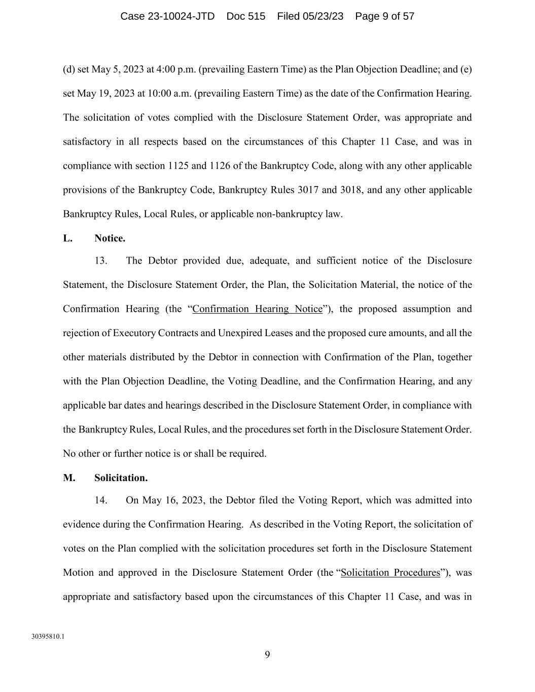 930395810.1(d)将2023年5月5日下午4时(美国东部时间)定为反对计划截止日期;及(e)将2023年5月19日上午10时(美国东部时间)定为确认聆讯日期。征集投票符合《披露声明令》,根据第11章案件的情况,在所有方面都是适当和令人满意的,并且符合《破产法》第1125和1126条,以及《破产法》的任何其他适用条款、《破产法》第3017和3018条,以及任何其他适用的《破产法》、《地方规则》或适用的非破产法。L.注意。13.债务人根据《破产规则》和《地方规则》,提供了关于披露声明、披露声明令、计划、征集材料、确认听证会通知(“确认听证会通知”)、执行合同和未到期租约的拟议承担和否决以及拟议补救金额的充分、充分的通知,以及债务人分发的与确认计划有关的所有其他材料,以及计划反对截止日期、投票截止日期和确认听证会,以及披露声明令中描述的任何适用的禁止日期和听证会,以及《披露声明令》中规定的程序。无须或无须另行通知。M.征集。14.2023年5月16日,债务人提交了表决报告,该报告在确认听证会上被接受为证据。如投票报告所述,就该计划征集投票符合披露声明动议中规定并在披露声明令中获得批准的征集程序(“征集程序”),根据第11章案件的情况是适当和令人满意的,并且在案件23-10024-JTD Doc 515中提交05/23/23第9页,共57页