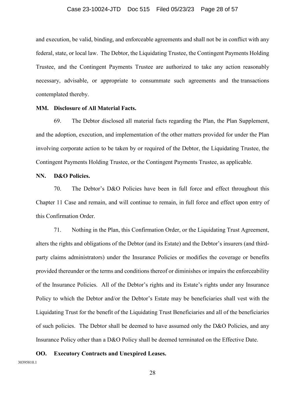 28303958 10.1和执行,均为有效、有约束力和可执行的协议,不得与任何联邦、州或地方法律相冲突。债务人、清算受托人、或有付款受托人和或有付款受托人有权采取任何合理必要、可取或适当的行动,以完成此类协议及其所设想的交易。MM.所有重大事实的披露。69.债务人披露了与计划、计划补充以及计划规定的其他事项的通过、执行和实施有关的所有重大事实,这些事项涉及债务人、清算受托人、或有付款持有受托人或或有付款受托人(如适用)将采取或要求采取的公司行动。NN. NN. NN. NN. NN. NN. NN. NN. NN. NN. NN. NN. NN. NN. NN. NN. NN. NN. NN. NN. NN. NN. NN. NN. NN. NN. NN. NN. NN. NN. NN. NN. NN. NN. NN. NN. NN. NN. NN. NN. NN. NN. NN. NN. NN. NN. NN. NN. NN. NN. NN. NN. NN. NN. NN. NN. NN. NN. NN. NN. NN. NN. NN. NN. NN. ND & O政策。70.债务人的D & O政策在整个第11章案件中一直完全有效,并且在本确认令生效时仍然有效,并将继续有效。71.本计划、本确认令或清算信托协议均不改变债务人(及其财产)和债务人的保险人(及第三方索赔管理人)在保险单下的权利和义务,也不改变根据保险单提供的保险范围或利益或其条款和条件,或削弱或损害保险单的可执行性。债务人和/或债务人遗产可能成为受益人的任何保险单所规定的债务人的所有权利及其遗产的权利,均应归属清算信托,以便清算信托受益人和该等保险单的所有受益人受益。债务人应被视为仅承担D & O保单,除D & O保单外的任何保单应被视为在生效日期终止。哦。执行合同和未到期租约。判例23-10024-JTD Doc 515提交05/23/23第28页,共57页
