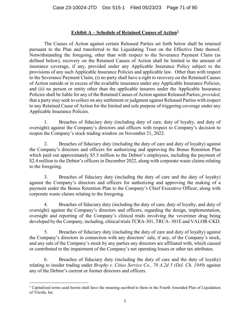 1 附件 A –保留诉讼因由一览表1下述针对某些被释放方的诉讼因由应根据本计划予以保留,并于计划生效之日移交清算信托。尽管如此,除与遣散费索偿(定义见下文)有关的索偿外,对保留诉讼因由的索偿,须限于根据任何适用保险单提供的保险范围(如有的话),但须符合任何该等适用保险单及适用法律的条文。除遣散费索偿外,(i)任何一方均无权在任何适用保险单下的可用保险之外或超出任何适用保险单下的可用保险的范围内,就保留的诉讼因由要求赔偿;(ii)除适用保险单下的适用保险人外,任何人或实体均不得对任何保留的针对被解除当事人的诉讼因由承担赔偿责任,但前提是,一方当事人可寻求就任何保留的诉讼因由对被解除当事人作出的任何和解或判决收取费用,其目的有限且仅限于触发任何适用保险单的承保范围。1.就公司于2022年11月21日重开股票交易窗口的决定而言,公司董事和高级职员违反了受托责任(包括注意义务、忠诚义务和监督义务)。2.公司董事和高级管理人员因授权和批准奖金保留计划而违反受托责任(包括注意义务和忠诚义务),该计划向债务人的雇员支付了约550万美元,其中包括2022年12月向债务人的高级管理人员支付的240万美元,以及与上述相关的公司废物索赔。3.违反公司董事及高级人员根据奖金保留计划授权及批准向公司行政总裁支付款项的受托责任(包括注意责任及忠诚责任),以及与上述事项有关的公司废物申索。4.违反公司董事和高级管理人员的受托责任(包括注意义务、忠诚义务和监督义务),涉及公司正在开发的veverimer药物的临床试验的设计、实施、监督和报告,包括临床试验TCRA-301、TRCA-301E和VALOR-CKD。5.在任何董事出售公司股票(如果有的话)以及任何董事所属的任何一方出售公司股票方面,违反公司董事的信托义务(包括注意义务和忠诚义务),导致或促成公司净经营亏损或其他税收属性的减值。6.违反Brophy诉Cities Service Co.,70 A.2d5(Del.)案中与内幕交易有关的信托义务(包括注意义务和忠诚义务)。第1949章)对债务人的任何现任或前任董事和高级管理人员提起诉讼。1此处使用的大写术语应具有Tricida, Inc.第四次修订清算计划中赋予它们的含义,案例23-10024-JTD Doc 515-1提交05/23/23第71页,共90页