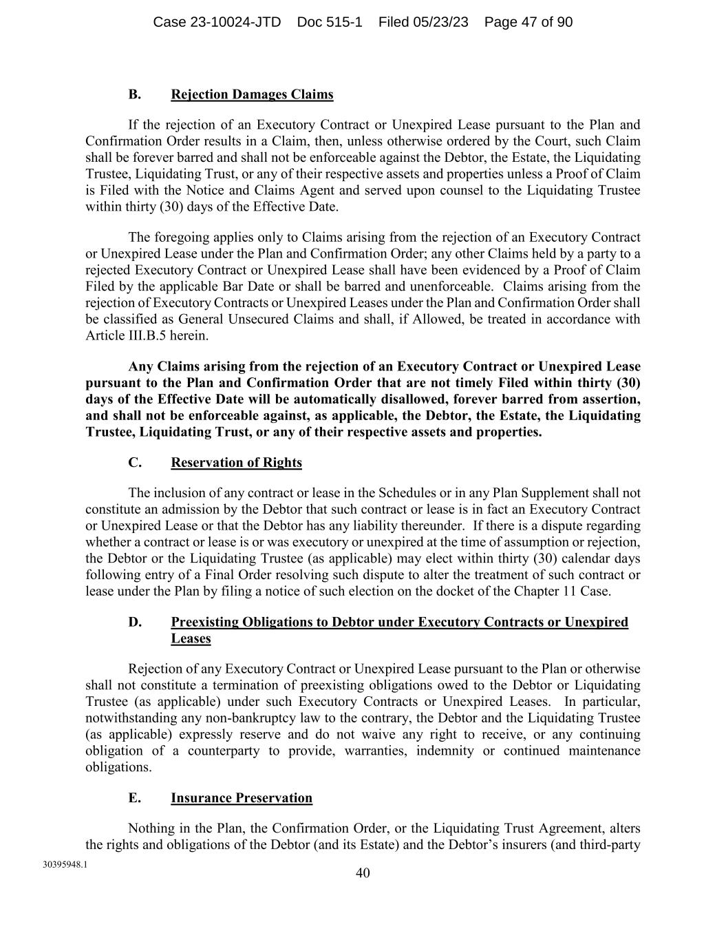 4030395948.1B.驳回损害赔偿索赔如果根据计划和确认令否决已执行合同或未到期租约导致索赔,则除非法院另有命令,否则该索赔将永远被禁止,并且不得对债务人、遗产、清算受托人、清算信托或其各自的任何资产和财产强制执行,除非在生效日期后三十(30)天内向通知和索赔代理人提交并送达清算受托人律师的索赔证明。上述规定仅适用于根据计划和确认令否决执行合同或未到期租约所引起的索赔;被否决的执行合同或未到期租约的一方所提出的任何其他索赔,应以适用的禁售日期提交的索赔证明为证据,或应被禁止且不可执行。根据计划和确认令,因拒绝执行合同或未到期租约而产生的债权应归类为一般无担保债权,如果允许,应按照本协议第III.B.5条处理。根据计划和确认令拒绝执行合同或未到期租约而产生的任何索赔,如未能在生效日期后三十(30)天内及时提交,将自动被驳回,永远被禁止主张,并且不得对债务人、遗产、清算受托人、清算信托或其各自的任何资产和财产(如适用)强制执行。权利保留将任何合同或租赁列入附表或任何计划补充文件,并不构成债务人承认该合同或租赁实际上是一项执行合同或未到期租赁,或债务人根据该合同或租赁承担任何责任。如果在承担或拒绝时,对于合同或租约是否已执行或尚未到期存在争议,债务人或清算受托人(视情况而定)可在解决此类争议的最终命令生效后三十(30)个日历日内,通过在第11章案件的案卷上提交有关选择的通知,选择改变该合同或租约在本计划下的处理方式。D.根据执行合同或未到期租约对债务人的既有义务根据本计划或其他方式拒绝任何执行合同或未到期租约,不构成终止根据此类执行合同或未到期租约对债务人或清算受托人(如适用)所欠的既有义务。特别是,尽管有任何与此相反的非破产法,债务人和清算受托人(视情况而定)明确保留并不放弃接受担保、赔偿或持续赡养义务的任何权利,或对方提供担保、赔偿或持续赡养义务的任何持续义务。E.保险保全计划、确认令或清算信托协议中的任何内容均不改变债务人(及其遗产)和债务人的保险人(以及第三方案例23-10024-JTD Doc 515-1提交05/23/23第47页,共90页