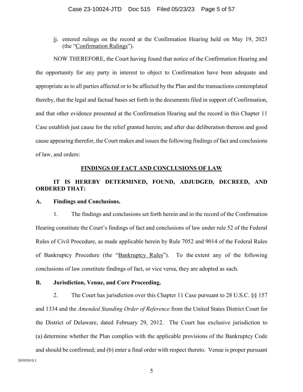 5 30395810.1 jj.在2023年5月19日举行的确认听证会(“确认裁决”)上记录在案的裁决。因此,法院认为,确认聆讯的通知及任何利益方反对确认的机会,对于受计划及其所设想的交易影响或将受其影响的所有各方而言,已经是充分和适当的,支持确认的文件所载的法律和事实依据,以及在确认聆讯上提出的其他证据和在第11章案件中的记录,为本条例所给予的济助确立了正当的理由,并在对此进行了适当的审议和为此提出的正当的理由之后,本法院作出并发布以下事实调查结论和法律结论,并下达命令:事实调查结果和法律结论在此确定、发现、裁定、裁定和命令:A.调查结果和结论。1.根据《联邦民事诉讼规则》第52条和《联邦破产程序规则》(“破产规则”)第7052条和第9014条适用的《联邦民事诉讼规则》(“破产规则”),本法院根据《联邦民事诉讼规则》第52条对事实和法律的结论作出了裁定。如果下列任何法律结论构成事实认定,或反之亦然,则作为事实认定予以采纳。管辖权、地点和核心程序。2.根据28 U.S.C. § § 157和1334以及2012年2月29日美国特拉华州地区法院经修订的《常规职权令》,本法院对第11章案件拥有管辖权。法院拥有专属管辖权:(a)确定该计划是否符合《破产法》的适用条款,并应予以确认;(b)就该计划作出最后命令。根据判例23-10024-JTD Doc 515提交05/23/23第5页,地点适当