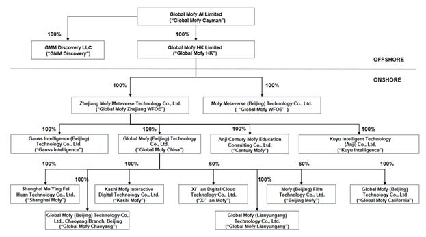 除另有说明外,如本招股章程所用,“Global Mofy Cayman”、“我们”、“我们”、“我们的公司”及“公司”指Global MOFY AI LIMITED,一家根据开曼群岛法律注册成立的豁免有限责任公司;“运营子公司”一词指以下根据中国法律组建的实体:浙江Mofy元宇宙科技有限公司,或Global Mofy浙江WFOE、Global Mofy(北京)科技有限公司,或Global Mofy China、Kashi Mofy Interactive Digital Technology Co.,Ltd.或Kashi Mofy,以及上海墨影飞环科技有限公司,或上海Mofy。