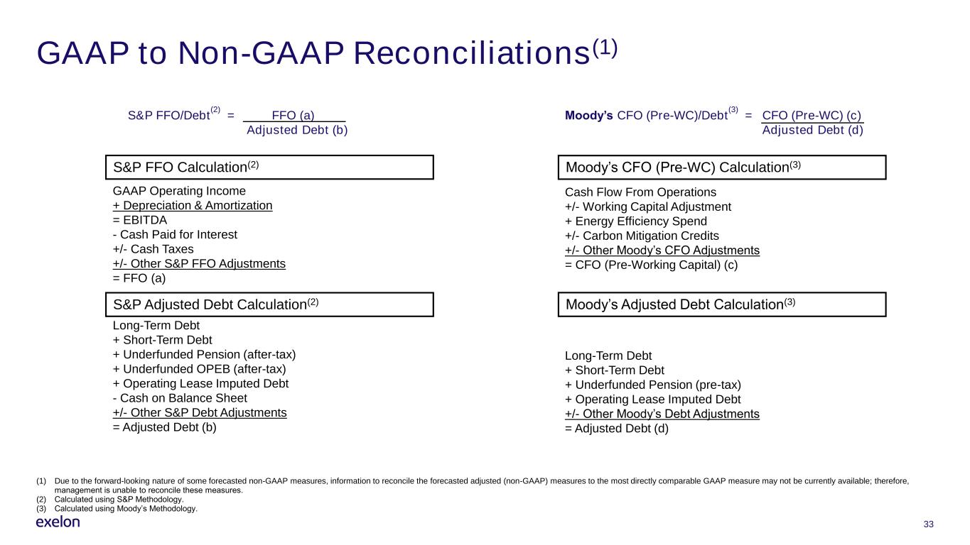 33GAAP与Non-GAAP对账(1)GAAP营业收入+折旧&摊销= EBITDA-现金支付利息+/-现金税+/-其他标普 FFO调整= FFO(a)长期债务+短期债务+资金不足的养老金(税后)+资金不足的OPEB(税后)+经营租赁推算债务-资产负债表上的现金+/-其他标普债务调整=调整后债务(b)标普 FFO计算(2)标普调整后债务计算(2)穆迪CFO(WC前)/债务(3)= CFO(WC前)(c)调整后债务(d)穆迪CFO(WC前)计算(3)运营现金流+/-营运资本调整+能效支出+/-碳缓排贷分+/-养老金(税前)+经营租赁估算债务+/-穆迪其他债务调整=调整后债务(d)标普 FFO/债务(2)= FFO(a)调整后债务(b)穆迪调整后债务计算(3)(1)由于某些预测的非公认会计原则措施的前瞻性,目前可能无法获得将预测的调整后(非公认会计原则)措施与最直接可比的公认会计原则措施进行核对的信息;因此,管理层无法对这些措施进行核对。(2)使用标普方法计算。(3)使用穆迪方法计算得出。