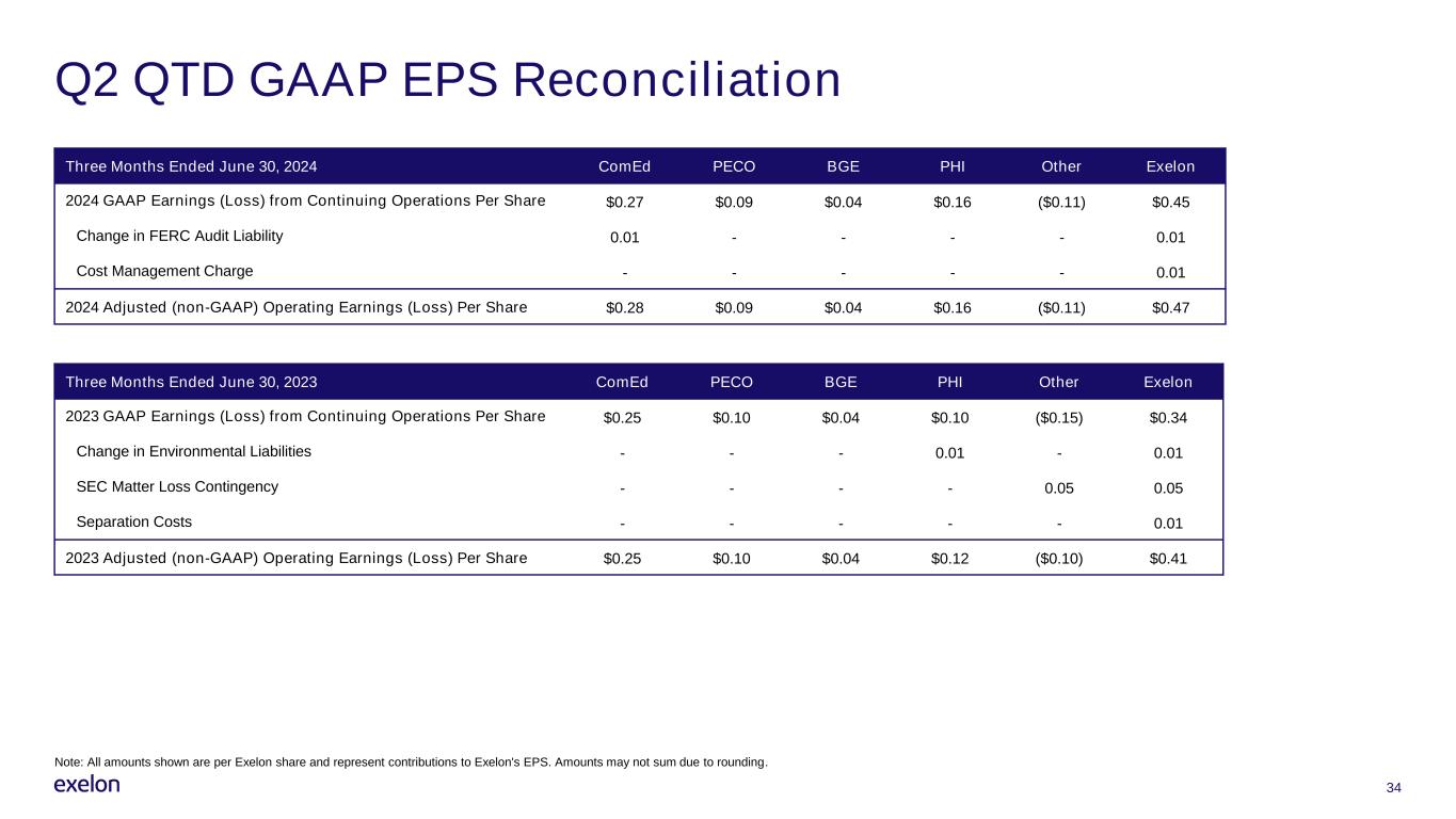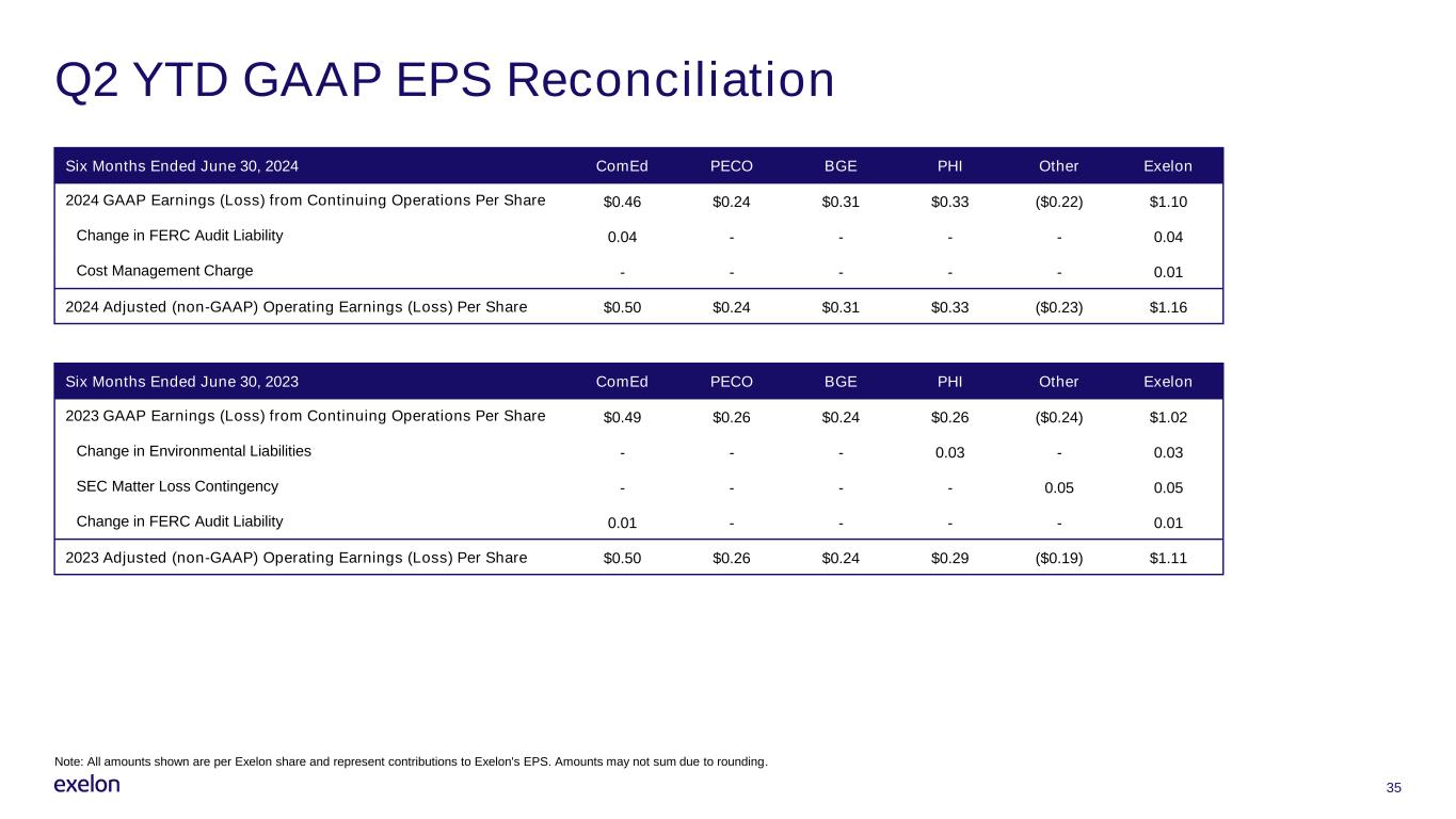 34 Q2 QTD GAAP每股收益对账截至2024年6月30日的三个月COM Ed PECO BGE PHI其他爱克斯龙 2024年GAAP持续经营收益(亏损)每股0.27美元0.09美元0.04美元0.16美元(0.11美元)0.45美元FERC审计负债变化0.01----0.01成本管理费用-----0.01 2024年调整后(非公认会计准则)营业收益(亏损)每股0.28美元0.09美元0.04美元0.16美元(0.11美元)0.47美元注:所示所有金额均为每股爱克斯龙份额,代表对爱克斯龙 EPS的贡献。由于四舍五入,金额可能不相加。截至2023年6月30日的三个月COEd PECO BGE PHI其他爱克斯龙 2023 GAAP持续经营收益(亏损)每股0.25美元0.10美元0.04美元0.10美元(0.15美元)0.34美元环境负债变化---0.01-0.01 SEC事项损失或有事项---0.05 0.05分离成本-----0.01 2023调整后(非GAAP)经营收益(亏损)每股0.25美元0.10美元0.04美元0.12美元(0.10美元)0.41美元