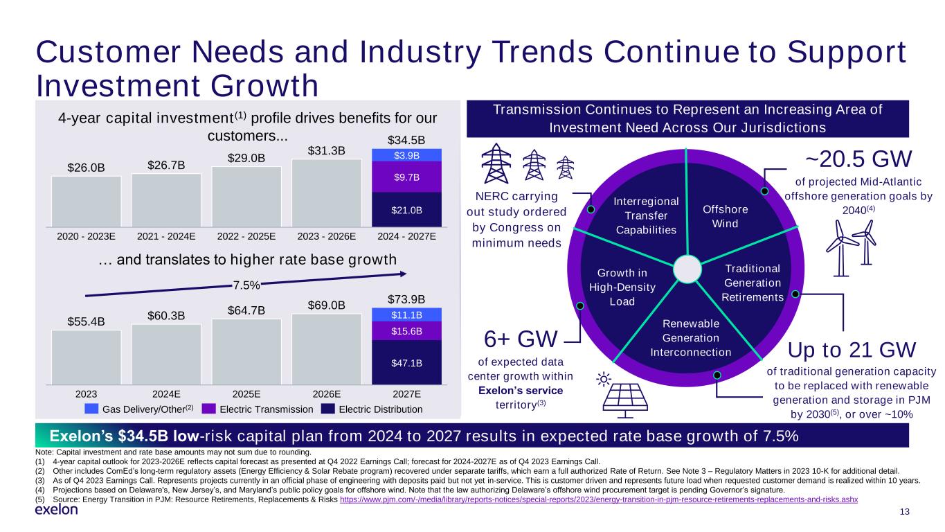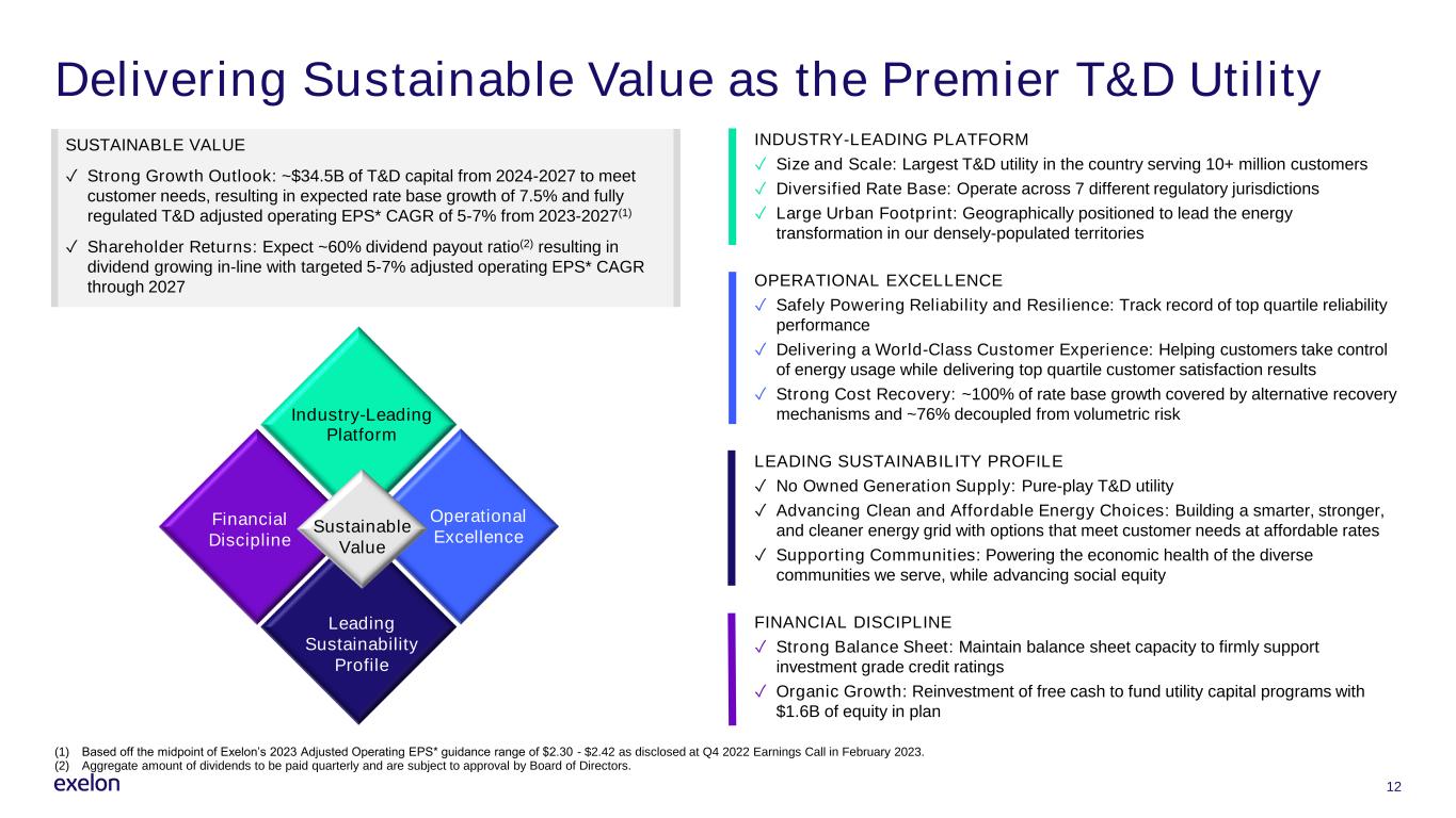 12提供可持续价值作为首要的T & D公用事业可持续价值丨强劲的增长前景:2024-2027年的T & D资本约为34.5B美元,以满足客户需求,导致预期费率基数增长7.5%和完全监管的T & D调整后经营EPS * 2023-2027年的复合年增长率为5-7 %(1)丨股东回报:预计~60%的派息率(2)导致股息增长符合目标5-7 %的调整后经营EPS *到2027年的复合年增长率行业领先的平台丨规模和规模:全国最大的T & D公用事业公司,服务于10 +百万客户丨多元化的费率基数:在7个不同的监管管辖区域开展业务丨大的城市足迹:地理位置优越,在我们人口稠密的地区引领能源转型运营卓越丨安全供电可靠性复原力和复原力:前四分之一可靠性性能的往绩记录丨提供世界一流的客户体验:帮助客户控制能源使用,同时提供前四分之一的客户满意度结果丨强劲的成本回收:~100%的费率基数增长由替代回收机制覆盖,~76%与体积风险导致的可持续性状况脱钩丨没有自有发电供应:纯粹的T & D实用程序丨推进清洁和负担得起的能源选择:建立一个更智能、更强大、更清洁的能源电网,并提供以负担得起的价格满足客户需求的选择丨支持社区:为我们所服务的多样化社区的经济健康提供动力,同时推进社会公平金融纪律丨强劲的资产负债表:保持资产负债表能力以坚定支持投资级信用评级丨有机增长:将自由现金再投资,为计划(1)中的1.6B美元股权的公用事业资本计划提供资金,基于2023年2月2022年第四季度财报电话会议上披露的2022年调整后营业EPS *指导范围为2.30美元至2.42美元的中点,即爱克斯龙 2023年调整后营业EPS *的中点。(2)按季度支付的股息总额,须经董事会批准。行业领先平台领跑可持续简介运营卓越财务学科可持续价值