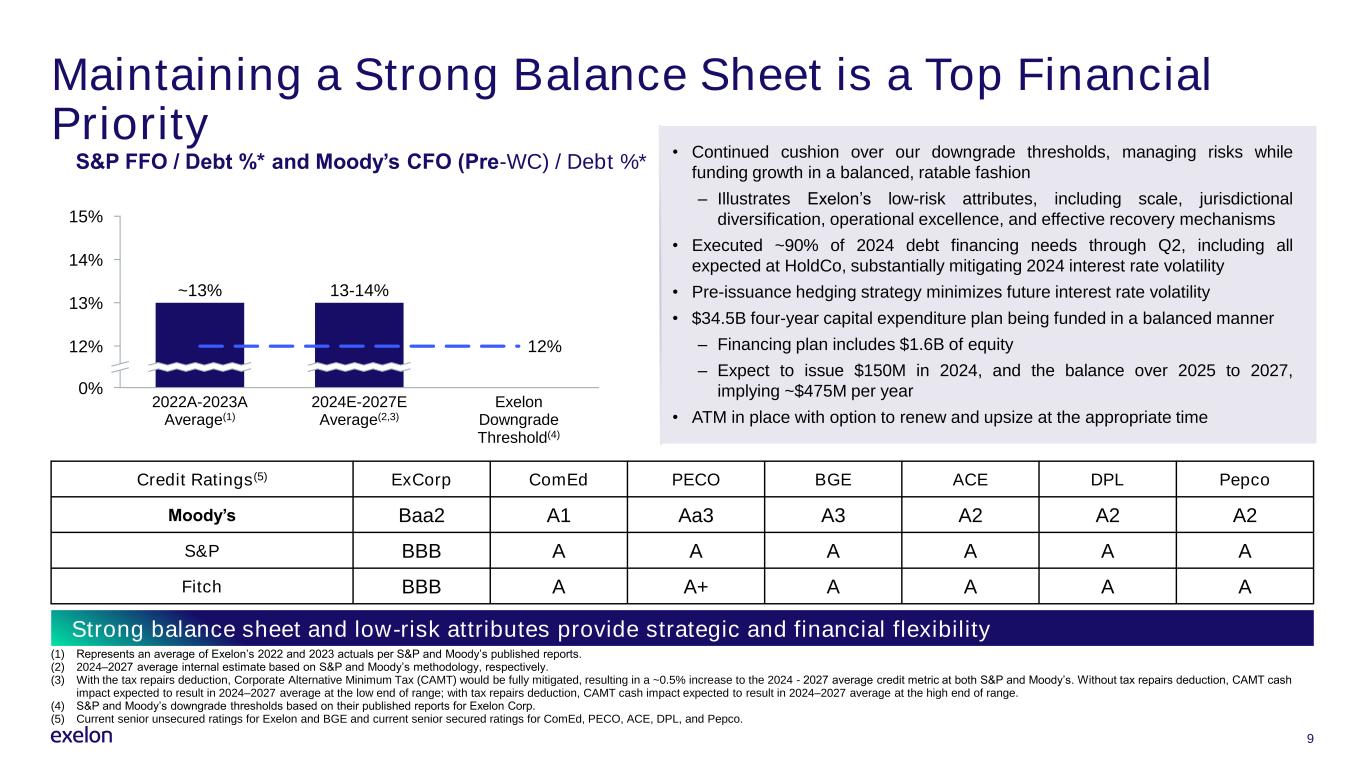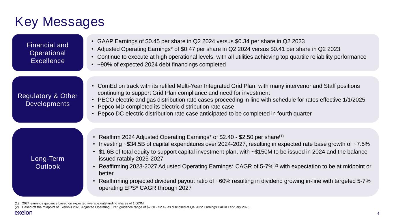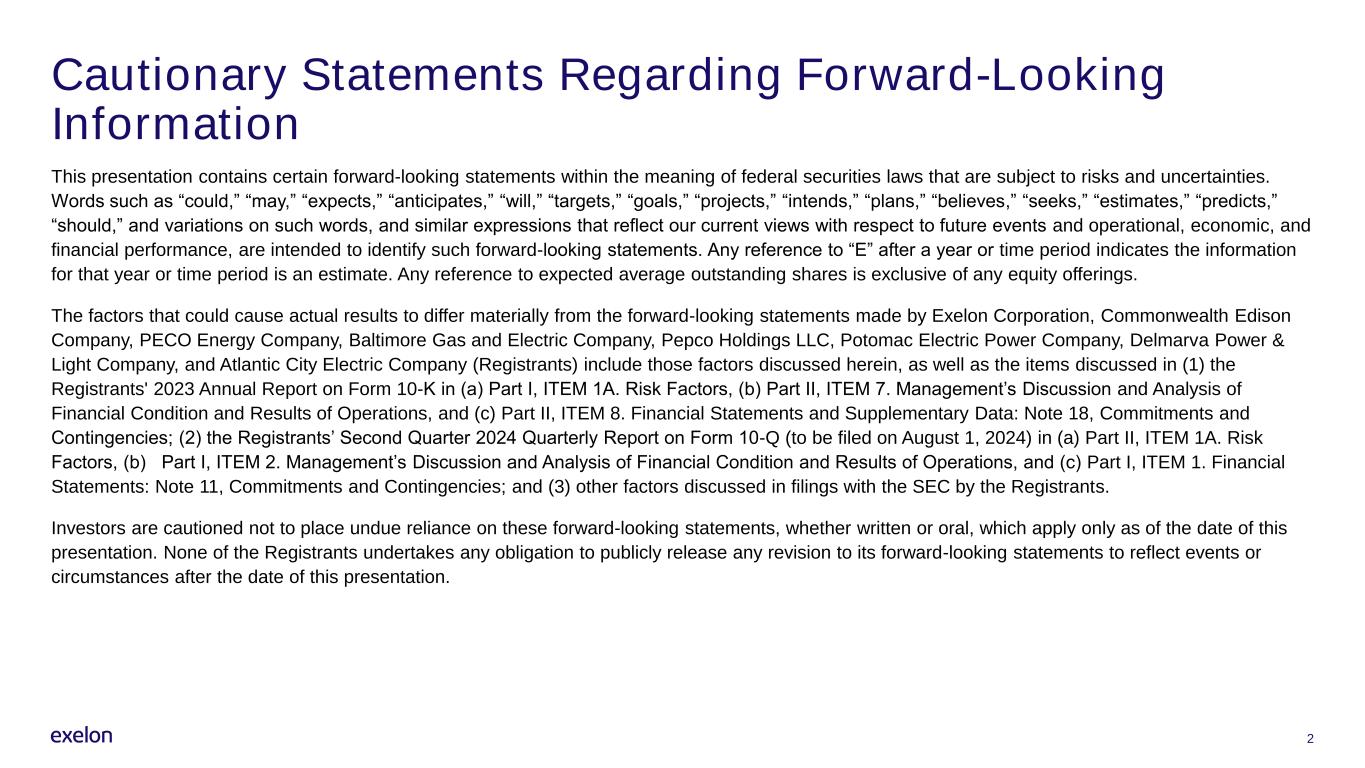 2关于前瞻性信息的警示性陈述本演示文稿包含联邦证券法含义内的某些前瞻性陈述,这些陈述受到风险和不确定性的影响。“可能”、“可能”、“预期”、“预期”、“将”、“目标”、“目标”、“项目”、“打算”、“计划”、“相信”、“寻求”、“估计”、“预测”、“应该”等词语以及这些词语的变体,以及反映我们目前对未来事件以及运营、经济和财务业绩的看法的类似表述,旨在识别此类前瞻性陈述。在一年或一段时间后提及“E”,表明该年或一段时间的信息是一种估计。任何对预期平均流通股的提及均不包括任何股票发行。可能导致实际结果与爱克斯龙公司、Commonwealth Edison Company、PECOEnergy Company、Baltimore Gas and Electric Company、波托马克 LLC、波托马克电力公司TERM4、Delmarva Power & Light Company和Atlantic City Electric Company(注册人)做出的前瞻性陈述存在重大差异的因素包括此处讨论的那些因素,以及(1)注册人在(a)第一部分第1A项中关于表格10-K的2023年年度报告中讨论的项目。风险因素,(b)第二部分,项目7。管理层对财务状况和经营成果的讨论和分析,以及(c)第二部分,项目8。财务报表和补充数据:附注18,承诺和或有事项;(2)注册人关于(a)第二部分第1A项中表格10-Q(将于2024年8月1日提交)的2024年第二季度季度季度报告。风险因素,(b)第一部分,项目2。管理层对财务状况和经营成果的讨论和分析,以及(c)第一部分,项目1。财务报表:附注11,承诺和或有事项;(3)注册人在向SEC提交的文件中讨论的其他因素。请投资者注意,不要过分依赖这些前瞻性陈述,无论是书面的还是口头的,这些陈述仅适用于本演示文稿发布之日。注册人均不承担任何义务公开发布对其前瞻性陈述的任何修订,以反映本演示文稿日期之后的事件或情况。