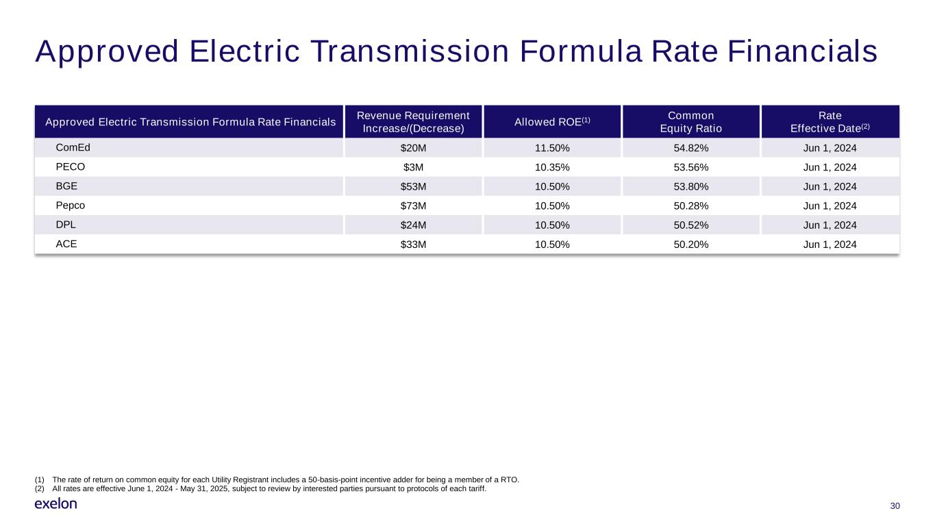 30批准的电力传输公式速率财务批准的电力传输公式速率财务收入要求增加/(减少)允许的ROE(1)普通股权益比率利率生效日期(2)ComED $ 2000万11.50% 54.82% 2024年6月1日June 1,2024 BGE $ 53M 10.50% 53.80% Jun 1,2024 Pepco $ 7300万10.50% 50.28% Jun 1,2024 DPL $ 24m 10.50% 50.52% Jun 1,2024 ACE $ 33m 10.50% 50.20% Jun 1,2024(1)每个公用事业注册人的普通股权益收益率包括作为RTO成员的50个基点的激励加法器。(2)所有税率均于2024年6月1日-2025年5月31日生效,但须由利害关系方根据每项关税的议定书进行审查。