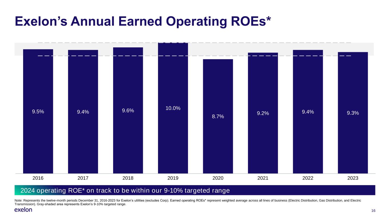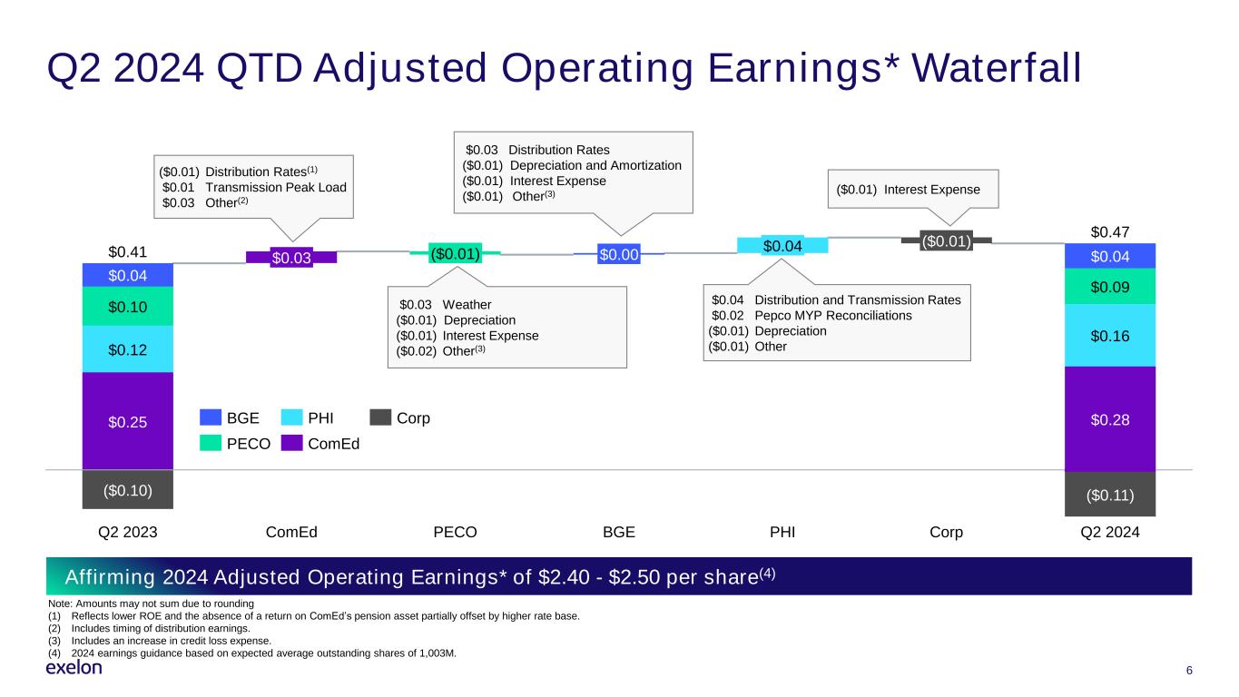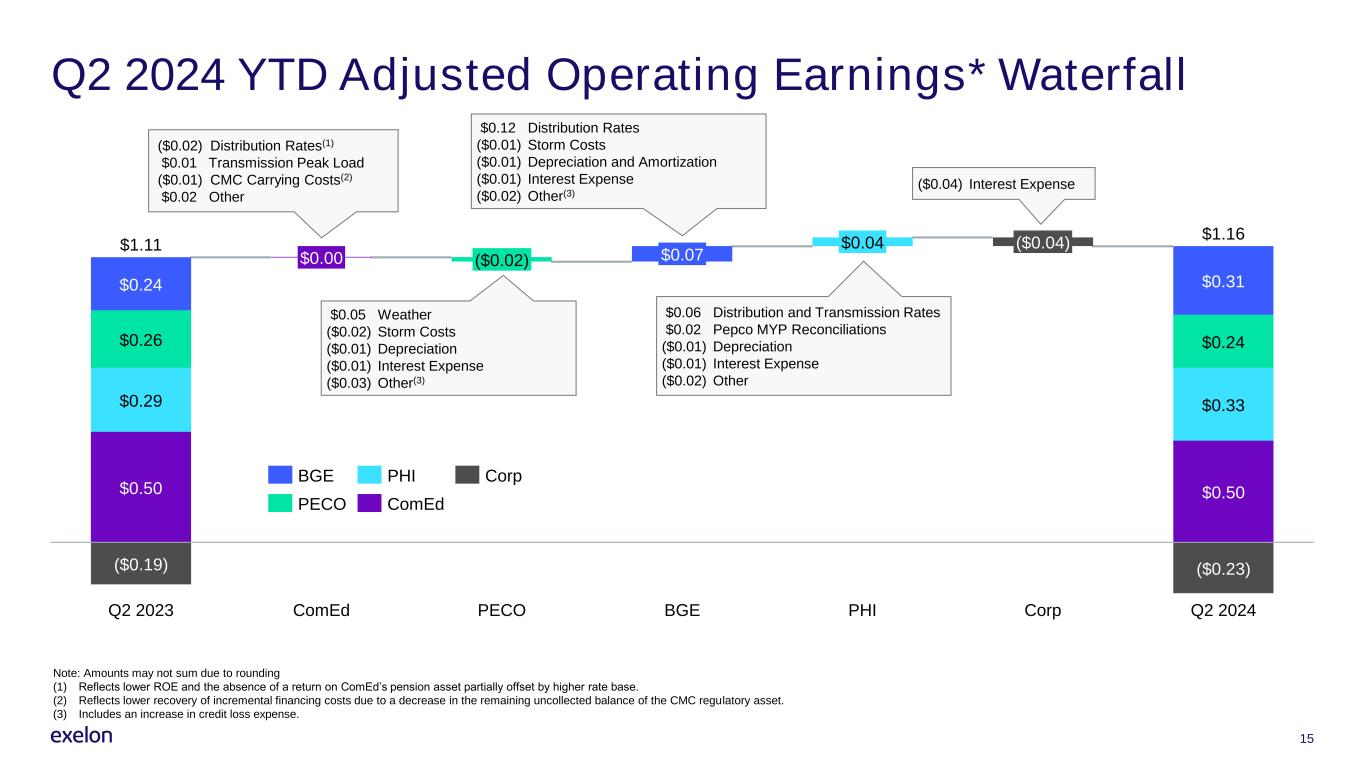 2024年第二季度年初至今调整后营业利润* Waterfall $ 0.50 $ 0.29 $ 0.33 $ 0.26 $ 0.24 $ 0.24 $ 0.24 $ 0.31($ 0.19)($ 0.23)Q2 2023 $ 0.00 COEd($ 0.02)PECO $ 0.07 BGE $ 0.04 PHI($ 0.04)Corp $ 0.50 Q2 2024 $ 1.11 $ 1.16 15 BGE TERM0 PHI COEd Corp($ 0.02)分配率(1)$ 0.01传输峰值负载($ 0.01)CMC承载成本(2)$ 0.02其他$ 0.05天气($ 0.02)风暴成本($ 0.01)折旧($ 0.01)利息费用($ 0.03)其他(3)$ 0.12分配率($ 0.01)风暴成本($ 0.01)折旧和摊销($ 0.01)利息费用($ 0.02)其他(3)$ 0.06分配和传输费率0.02美元Pepco MYP调节(0.01美元)折旧(0.01美元)利息费用(0.02美元)其他(0.04美元)利息费用注:由于四舍五入,金额可能不相加(1)反映了较低的ROE和没有COMED养老金资产的回报部分被较高的费率基数所抵消。(2)反映CMC监管资产剩余未收余额减少导致增量融资成本回收较低。(3)包括信用损失费用的增加。