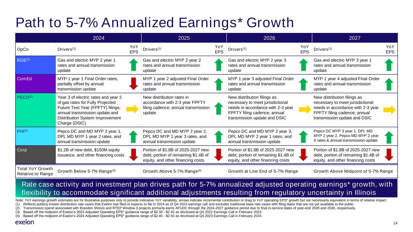 13客户需求和行业趋势继续支持投资增长$ 26.0B $ 26.7B $ 29.0B $ 31.3B $ 21.0B $ 9.7B $ 3.9B 2020-2023E 2021-2024E 2022-2025E 2023-2026E 2024-2027E $ 34.5B…并转化为更高的利率基数增长4年资本投资(1)简介为我们的客户带来利益..。注:由于四舍五入,资本投资和费率基数金额可能不相加。(1)2023-2026年4年资本前景反映了2022年第四季度财报电话会议上提出的资本预测;截至2023年第四季度财报电话会议的2024-2027年预测。(2)其他包括根据单独关税收回的COMED长期监管资产(Energy Efficiency & Solar Rebate Program),这些资产获得全额授权回报率。有关更多详细信息,请参见附注3 – 2023年10-K中的监管事项。(3)截至2023年第四季度财报电话会议。代表目前处于正式工程阶段、已付定金但尚未投入使用的项目。这是客户驱动的,当要求的客户需求在10年内实现时,它代表了未来的负荷。(4)基于特拉华州、新泽西州、马里兰州海上风电公共政策目标的预测。请注意,授权特拉华州海上风电采购目标的法律正在等待州长签署。(5)资料来源:PJM中的能源转型:资源退役,替代与风险https://www.pjm.com/-/media/library/reports-notices/special-reports/2023/energy-transition-in-pjm-resource-retirements-replacements-and-risks.ashx 爱克斯龙的2024-2027年34.5B美元低风险资本计划导致预期利率基数增长7.5% $ 55.4B $ 60.3B $ 64.7B $ 69.0B $ 47.1B $ 15.6B $ 11.1B 2023 2024E 2025E 2026E 2027E $ 73.9B 7.5%天然气输送/其他(2)输电配电输电继续代表着我们整个司法管辖区投资需求不断增加的领域高密度负荷可再生发电互联互通的区域间转移能力增长传统发电退役海上风电~20.5吉瓦预计中至2030年PJM将有高达21GW的传统发电容量被替换为可再生发电和存储(5),或超过~10%