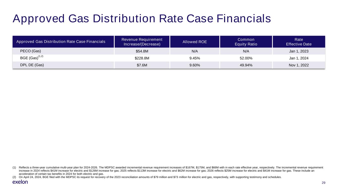 29批准的配气率案例财务批准的配气率案例财务收入要求增加/(减少)允许的ROE普通股比例率率生效日期PECO(Gas)$ 5480万N/A N/A 2023年1月1日BGE(Gas)(1,2)$ 2.288亿9.45% 52.00% 2024年1月1日DPL DE(Gas)$ 760万9.60% 49.94% 2022年11月1日(1)反映了2024-2026年的三年累计多年计划。MDPSC授予的增量收入要求在每个费率有效年度分别增加1.67亿美元、1.75亿美元和6600万美元。2024年增加的收入要求反映了电力增加4100万美元,天然气增加1.26亿美元;2025年反映了电力增加1.13亿美元,天然气增加6200万美元;2026年反映了电力增加2500万美元,天然气增加4100万美元。其中包括在2024年加快对电力和天然气的某些税收优惠。(2)2024年4月24日,BGE向MDPSC提交请求,要求分别追回2023年电力和天然气调节金额7900万美元和7300万美元,并附有支持性证词和时间表。