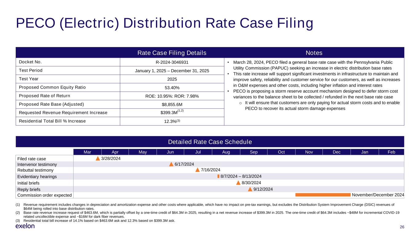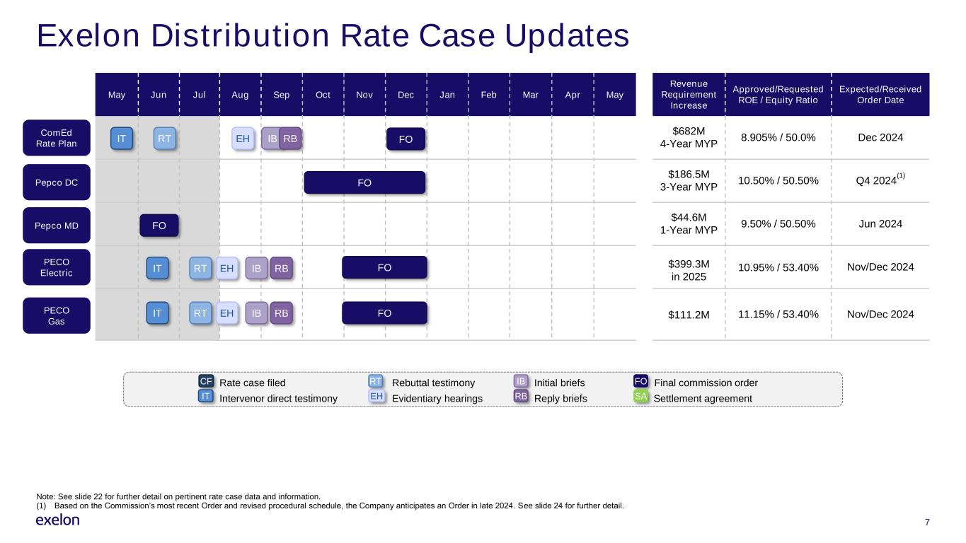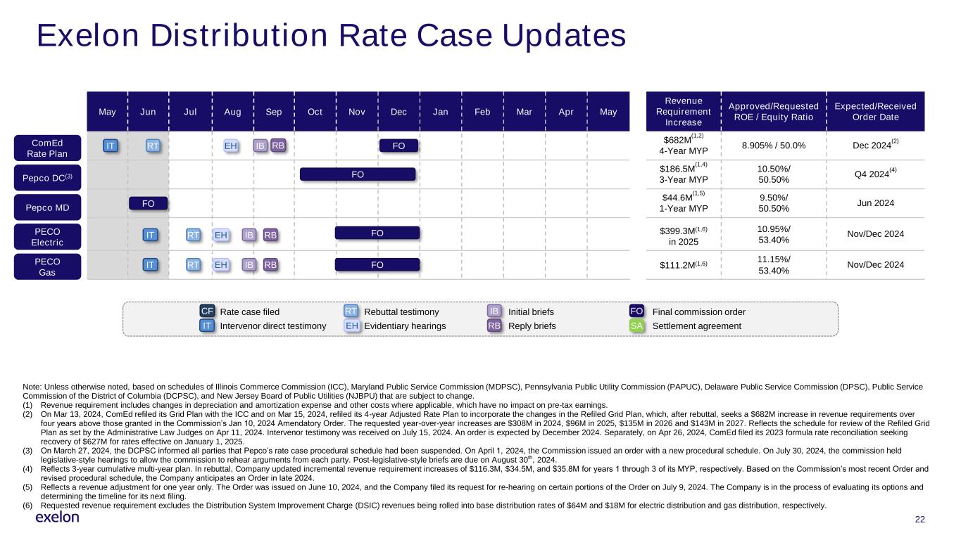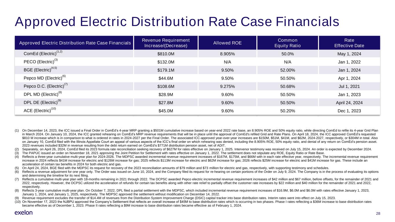 28批准配电率案例财务批准配电率案例财务收入要求增加/(减少)允许ROE普通股比率率生效日期comed(electric)(1,2)$ 810.0m 8.905% 50.0% May 1,2024 PECO(electric)(3)$ 132.0m n/a n/a Jan 1,2022 BGE(electric)(4,5)$ 179.1m 9.50% 52.00% Jan 1,2024 Pepco MD(electric)(6)$ 446m 9.50% 50.50% Apr 1,2024 Pepco DC(electric)(7)$ 1.086m 9.275% 50.68% Jul 1,2021 DPL MD(electric)(8)$ 2890万9.60% 50.50% January 1,2023 DPL DE(electric2023(1)2023年12月14日,ICC在COMED的4年MRP中发布最终命令,根据2022年年底的费率基数、8.905%的ROE和50%的股权比例,授予累计5.01亿美元的增量,同时指示COMED在2024年3月重新提交其4年网格计划。2024年1月10日,ICC批准对COMED的MRP收入要求进行重新听证,该要求将一直有效,直到COMED重新提交的网格和费率计划获得批准。2024年4月18日,ICC批准了COMED要求增加的8.1亿美元,这与2024-2027年根据最终订单订购的费率相比。与之相关的ICC批准的2024-2027年同比增长分别为1.5亿美元、5100万美元、4100万美元和6200万美元,总计3.04亿美元。同样在1月10日,COMED向伊利诺伊州上诉法院提交了对ICC最终命令的多个方面的上诉,该命令被拒绝重新审理,其中包括8.905%的ROE、50%的股权比例,以及拒绝对COMED的养老金资产进行任何回报。2023年的收入包括3200万美元的收入,该收入来自于COMED的7.71亿美元分配养老金资产所获得的债务回报,扣除ADIT。(2)另外,2024年4月26日,COMED提交了2023年公式利率对账,寻求为2025年1月1日生效的利率追回6.27亿美元。干预者证词于2024年7月15日收到。预计将于2024年12月获得订单。(3)PAPCC于2021年11月18日发布命令,批准于2022年1月1日生效的以差饷结算的联合呈请。该结算未规定任何ROE、权益比率或费率基数。(四)体现2024-2026三年累计多年期规划。MDPSC授予的增量收入要求在每个费率有效年度分别增加1.67亿美元、1.75亿美元和6600万美元。2024年的增量收入要求增加反映了电力增加4100万美元,天然气增加1.26亿美元;2025年反映了电力增加1.13亿美元,天然气增加6200万美元;2026年反映了电力增加2500万美元,天然气增加4100万美元。其中包括在2024年加快对电力和天然气的某些税收优惠。(5)2024年4月24日,BGE向MDPSC提交请求,要求分别追回2023年电力和天然气调节金额7900万美元和7300万美元,并附有证言和时间表。(6)仅反映一年的收入调整。该命令于2024年6月10日发出,公司于2024年7月9日就该命令的某些部分提出重新聆讯的请求。该公司正在评估其选择,并确定下一次提交申请的时间表。(7)反映2021年至2022年剩余18个月的累积多年计划。DCPSC授予Pepco Electric在2021年剩余时间和2022年分别增加4200万美元和6700万美元的抵消前增量收入要求。然而,DCPSC利用某些税收优惠的加速退款以及其他税率减免,在2021年剩余时间和2022年分别部分抵消了客户税率增加的2200万美元和4000万美元。(八)体现3年累计多年计划。2022年10月7日,DPL向MDPSC提交了部分和解,其中包括增加1690万美元、600万美元和600万美元的增量收入要求,费率分别于2023年1月1日、2024年1月1日和2025年1月1日生效。MDPSC于2022年12月14日未经修改批准了这项和解。(9)收入要求不包括将1440万美元的收入从分配系统改进费用(DSIC)资本跟踪器转入基本分配费率。临时利率于2023年7月15日生效。(10)2023年11月17日,NJBPU批准了公司的和解协议,该协议反映了基本分配率整体增加4500万美元,这将分两个阶段发生。反映基础分配费率增加3600万美元的第一阶段费率自2023年12月1日起生效。第二阶段费率反映基础分配费率增加900万美元,自2024年2月1日起生效。
