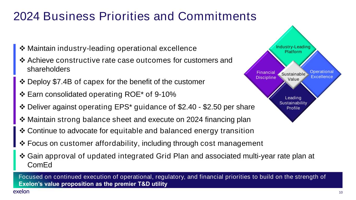 102024年业务优先事项和承诺侧重于持续执行运营、监管、和财务优先事项,以建立在爱克斯龙作为首要T & D公用事业的价值主张的实力之上丨保持行业领先的卓越运营↓为客户和股东实现建设性的费率案例结果丨为客户的利益部署7.4B美元的资本支出丨赚取9-10 %的综合运营ROE * ↓根据每股2.40美元至2.50美元的运营EPS *指导交付↓保持强劲的资产负债表并执行2024年融资计划行业领先的平台领先的可持续发展概况运营卓越财务纪律可持续价值丨继续倡导公平和平衡的能源转型丨专注于客户的负担能力,包括通过成本管理↓在COMED上获得更新的综合网格计划和相关的多年费率计划的批准